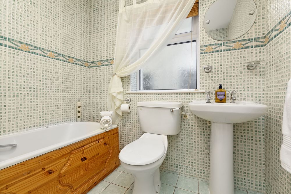 Tiled floor. Tiled splashback. Pine kitchen units with integrated oven. Double doors to living room. Door to rear garden.