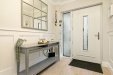 Laminate flooring. Carpet to stairs with wooden bannisters. Decorate paneling to walls & coving to ceiling.