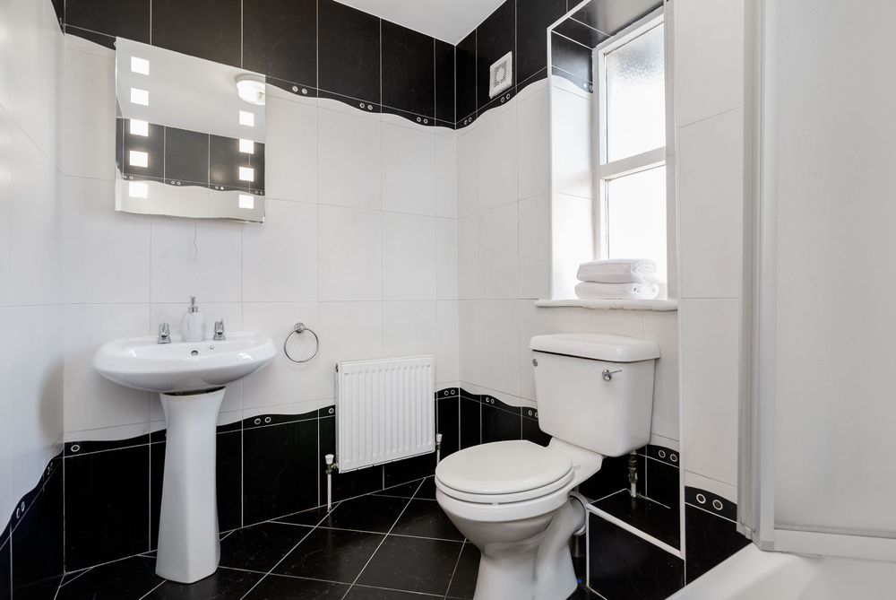 Fully tiled floor to ceiling. WC & WHB. Bath with overhead shower (mains).