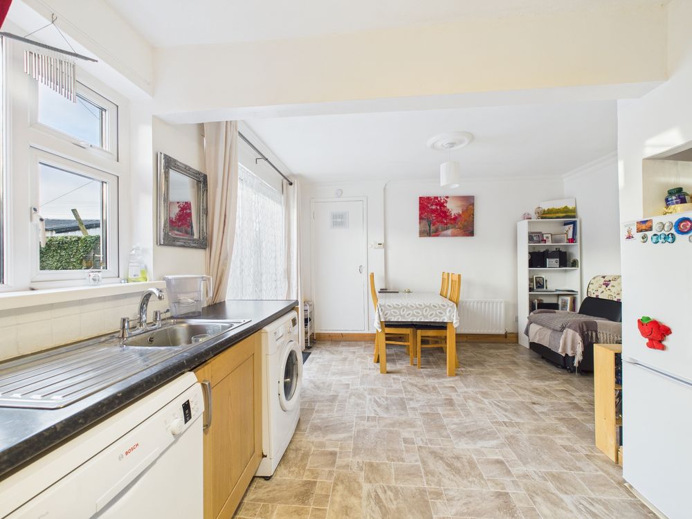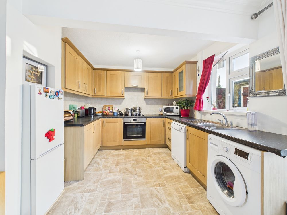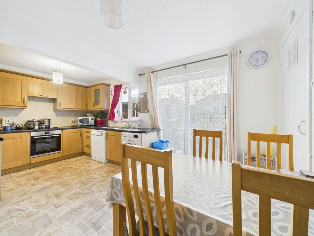 A large kitchen dining room stretches the full width of a house offering excellent natural light flooding through a large picture window and double patio doors. With a most attractive fitted kitchen there is excellent cupboard and storage space.