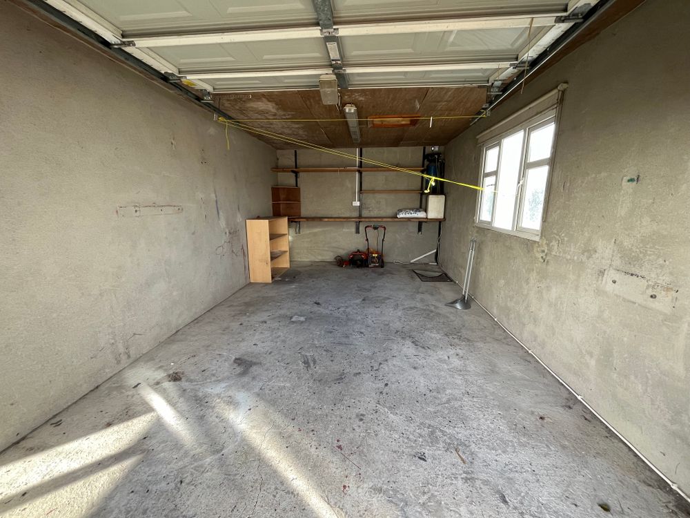 A spacious garage at the rear of the house with an up-and-over door and a side window. A side passage leads to a convenient fuel storage area.
