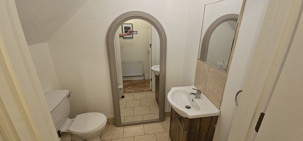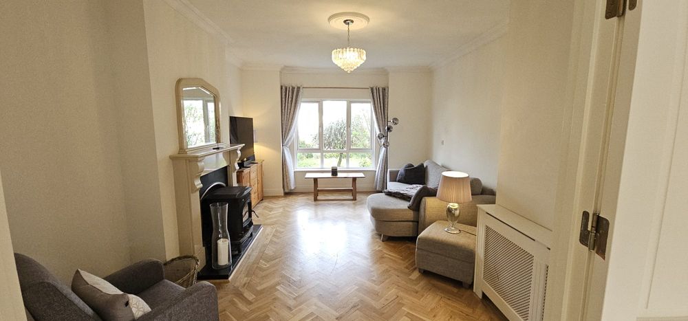 A separate utility room off the kitchen provides additional work surfaces, under-sink storage, and is plumbed for a washing machine and dryer. The utility also features floor-to-ceiling cupboards, ensuring ample storage. From the dining area, double doors lead into a bright and inviting living room. This space is finished with the same stunning herringbone timber flooring, a marble-surround fireplace, and a large stove, creating a cosy atmosphere. The ground floor also includes a generously sized double bedroom with a timber floor and a luxurious en-suite shower room. The en-suite is finished with beautiful tiles, built-in shelving, and a heated towel rail.
