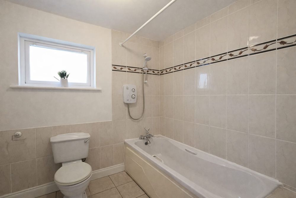 Tiled walls and floor, fitted with a bath, wash hand basin, and a Triton Novel SR shower positioned over the bath.
