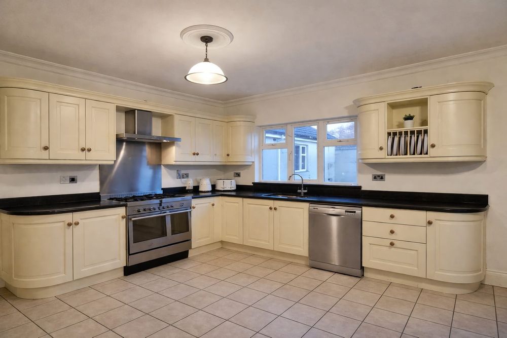An spacious and light-filled kitchen and dining area, fitted with a bespoke kitchen featuring a contemporary granite work surface. Additional highlights include curved corner units, large press drawers, and a separate cupboard with basket drawers. Appliances include a larder freezer, Zanussi dishwasher, Waterford range cooker with a five-burner gas hob and double oven, Bush chest freezer. The room offers direct access to the patio area via sliding doors and connects to the utility room.