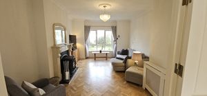 A bright and inviting reception room with a timber herringbone floor, large windows to the front, and a solid fuel stove as the centrepiece.