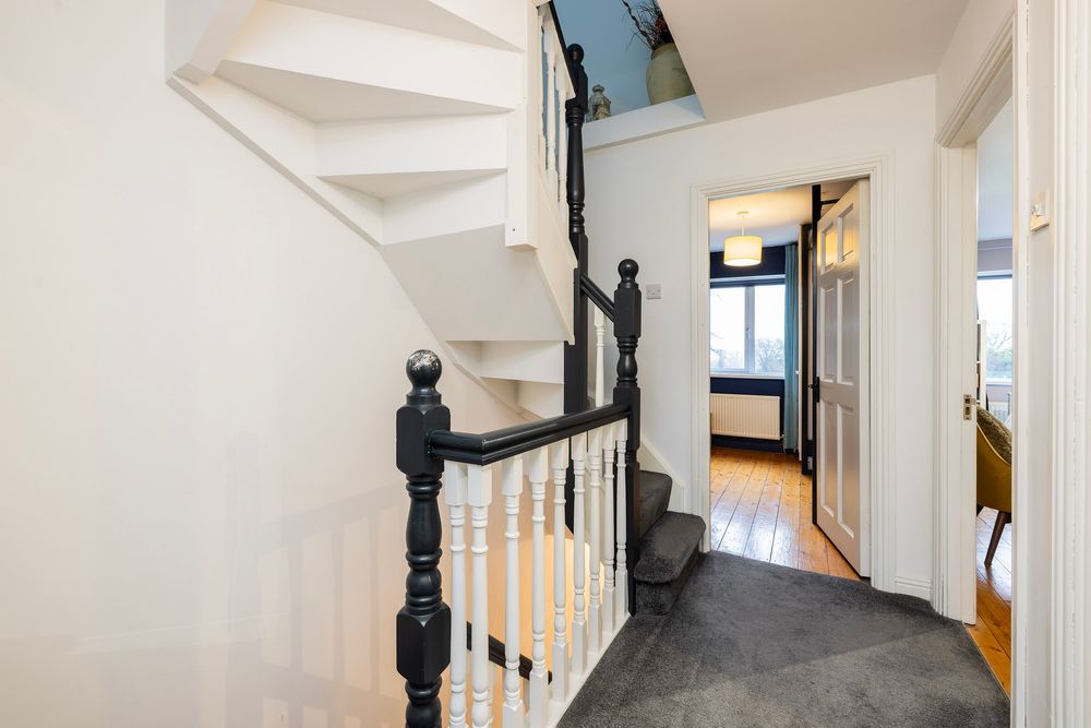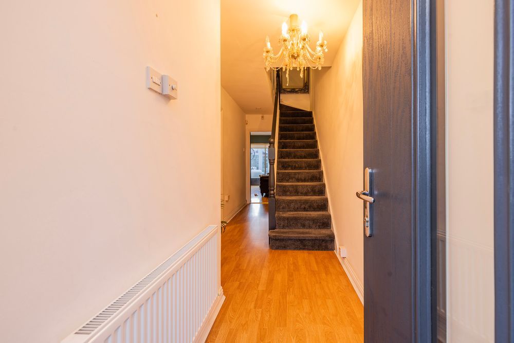 A bright welcoming entrance hallway sets the tone perfectly with timber flooring at foot creating a stylish yet practical statement, here an angled staircase with luxurious carpeting in a contemporary neutral shade rises to the upper floors.