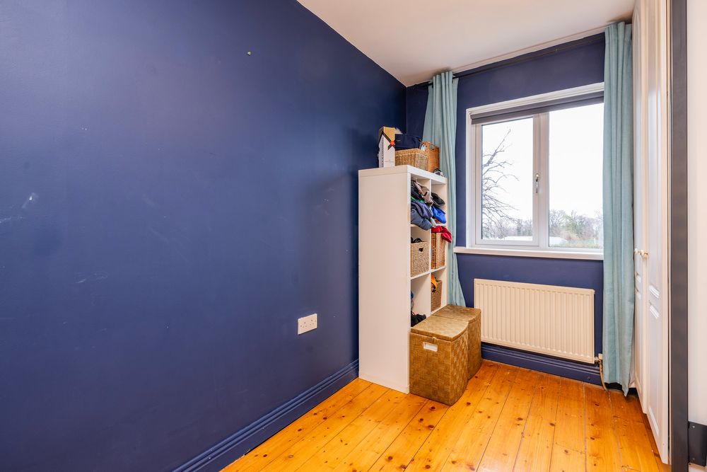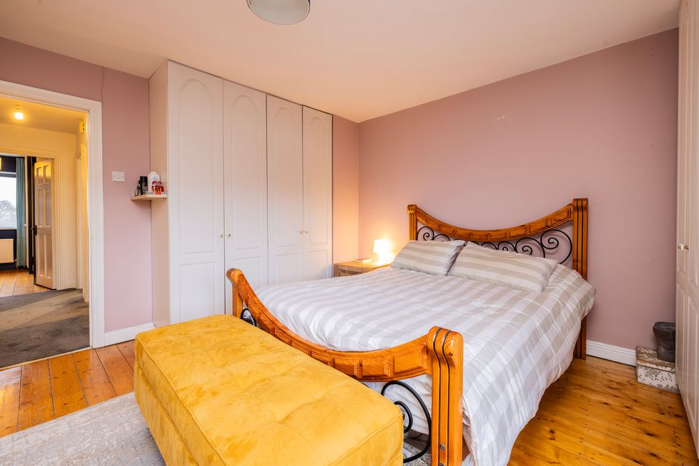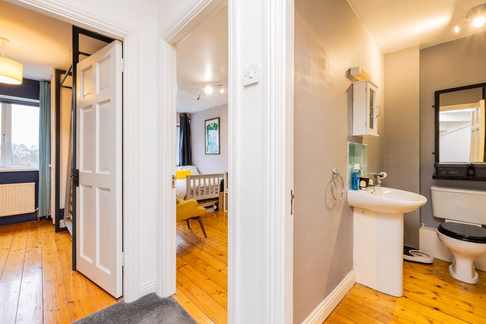This bright primary suite is situated to the rear of the property and overlooks the garden below, two banks of floor to ceiling fitted wardrobes provide an abundance of storage, the room is complete with polished timber floorboards. En suite shower room with wc, wash hand basin and shower cubicle home to a Mira Elite electric shower unit and tiled walls.