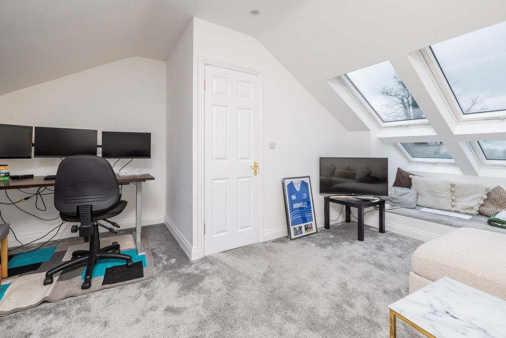 This floor is home to a truly stunning attic room perfect for a variety of uses, the room stylishly features four velux windows in a square Quattro design layout to bring even more natural light into the space and unlocking superb sea views. A charming window seat is the perfect space to sit back and relax with a book, while the eaves areas providing plenty of storage. The room is complete with sumptuous carpeting in a contemporary shade.