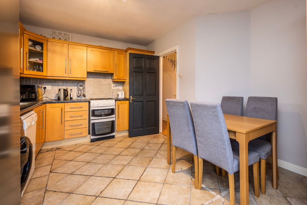 This bright and airy kitchen diner boast ample room for designated cooking and dining areas, a picture window here enjoys wonderful open aspect overlooking the green in front and floods the room with natural light. The kitchen area features a range of fitted Shaker style wall and floor units with ample worktop space for food prep. The kitchen is complete with a tiled splash back and floor in a warm neutral shade.