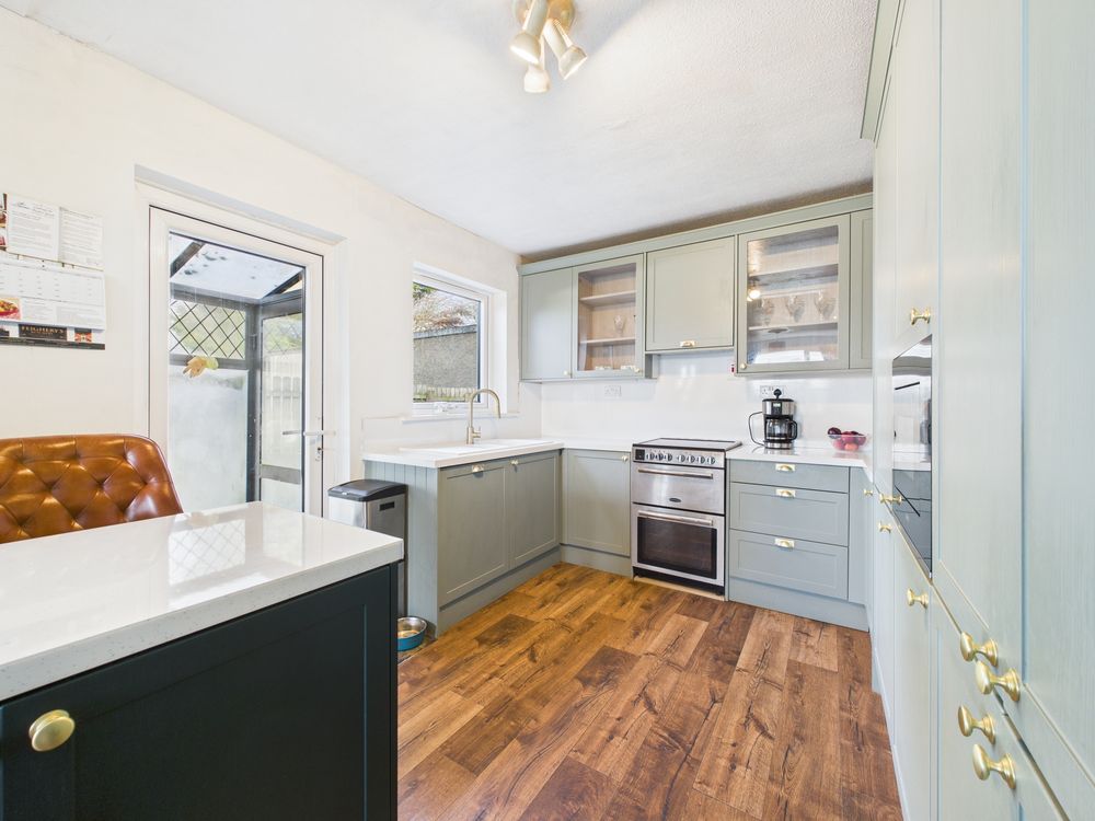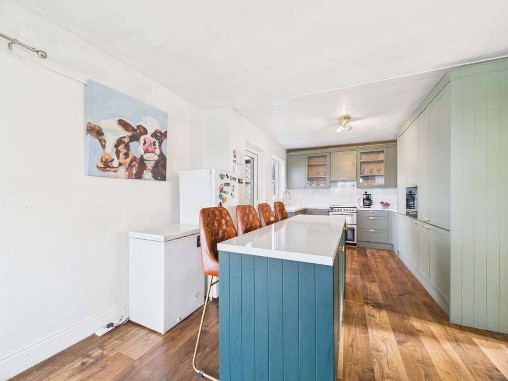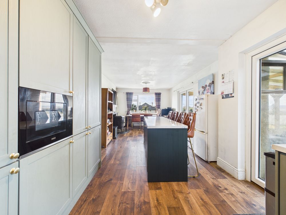 To the rear of the property lies the standout feature – an exceptionally large open-plan kitchen/dining space. This impressive room is flooded with natural light and fitted with a stunning modern kitchen complete with ample wall and floor units, quality worktops and a central island with breakfast seating. The generous proportions make this an ideal space for family living and entertaining alike, while the integrated appliances and solid fuel stove adds further charm and comfort.