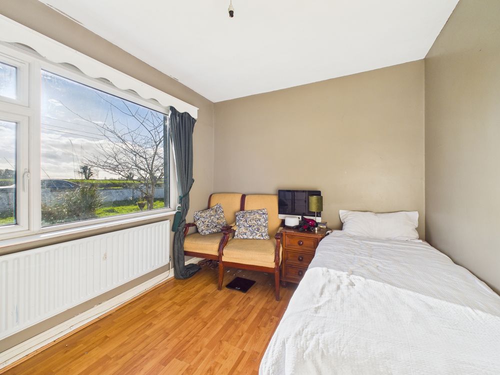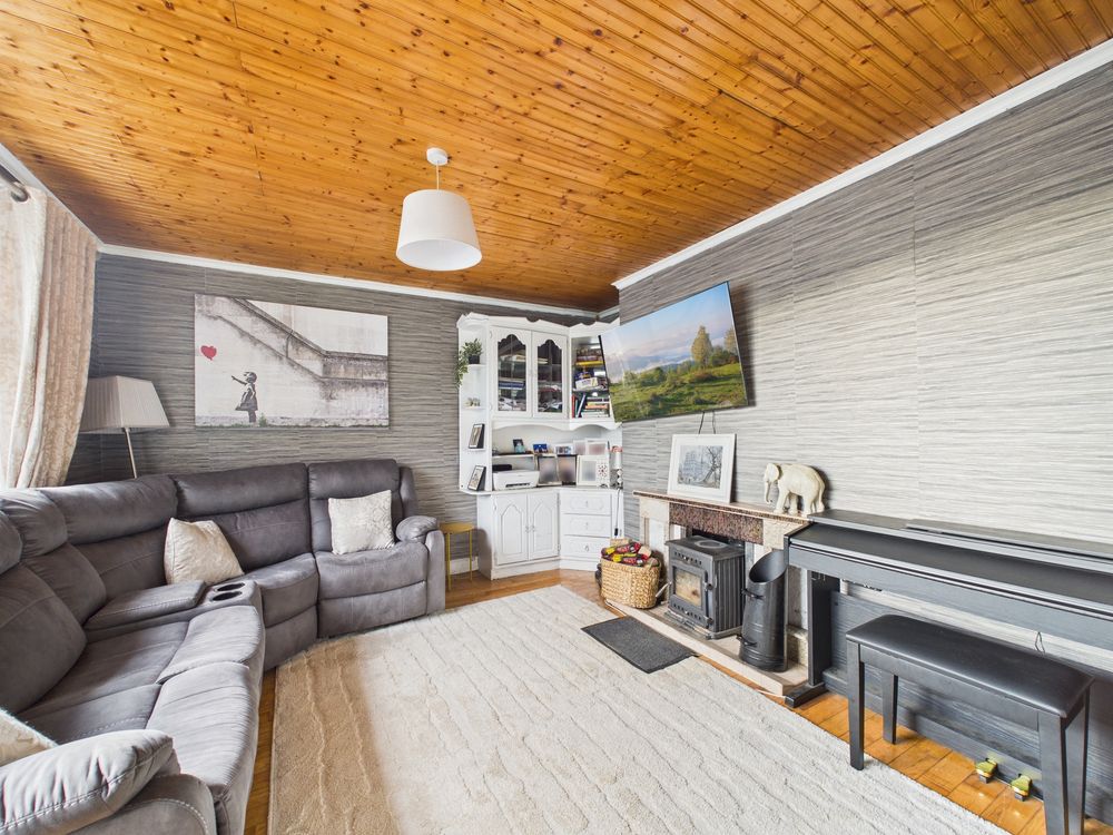 On entering, a long central hallway provides access to all accommodation and is finished with attractive timber flooring, which continues seamlessly through much of the home. To the front, the living room is a relaxing and spacious area, featuring a solid fuel stove set within a fireplace surround, creating a warm focal point for everyday living.