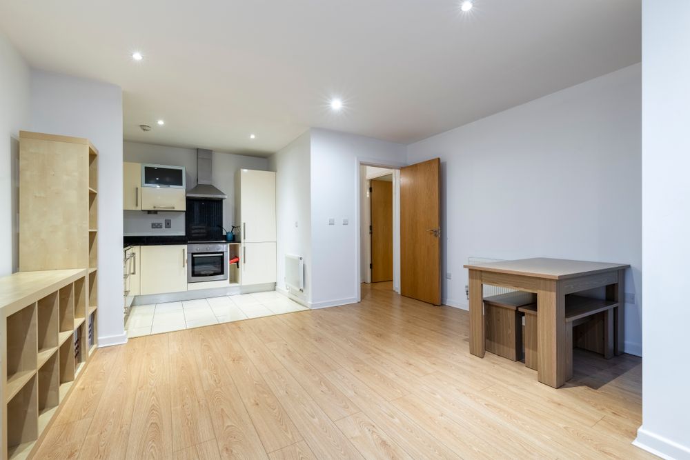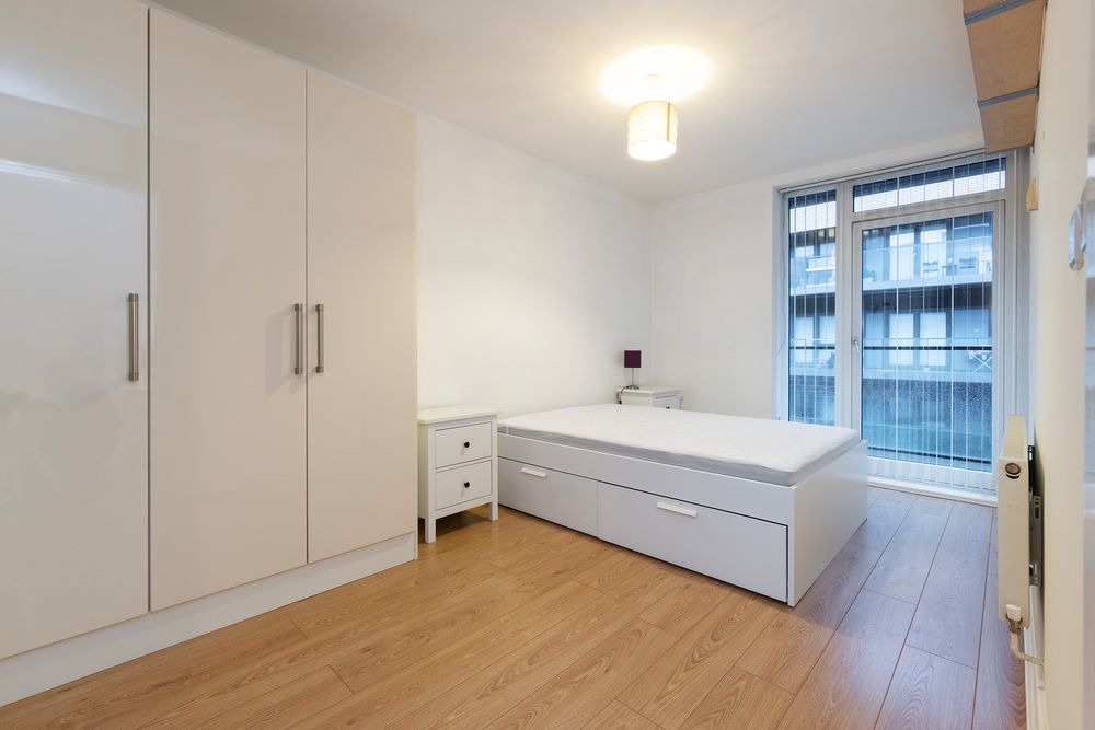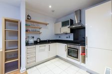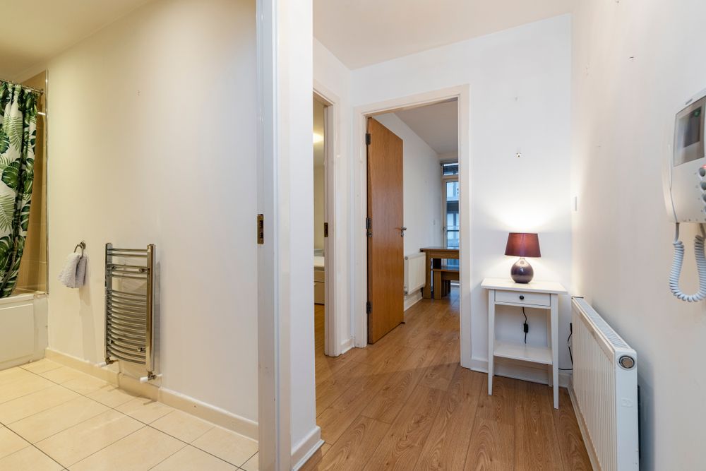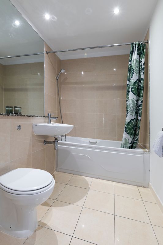 Retreat to the generously sized bedroom, which features inviting south-facing windows, built-in wardrobes, and easy access to the balcony. The family bathroom is a sanctuary of relaxation, complete with a deep-fill bath, an overhead shower, a contemporary wash-hand basin, a WC, a heated towel rail, and stylish floor-to-ceiling tiles.