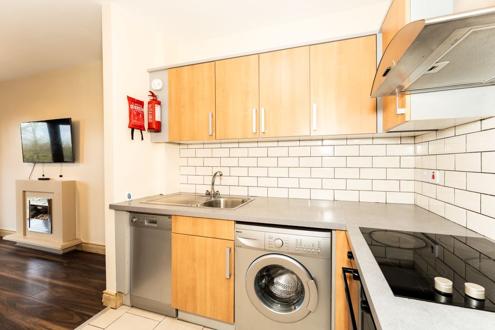 Fully fitted kitchen units, fridge freezer, washing machine, dishwasher, Electric oven and hob, tiled flooring and splashback