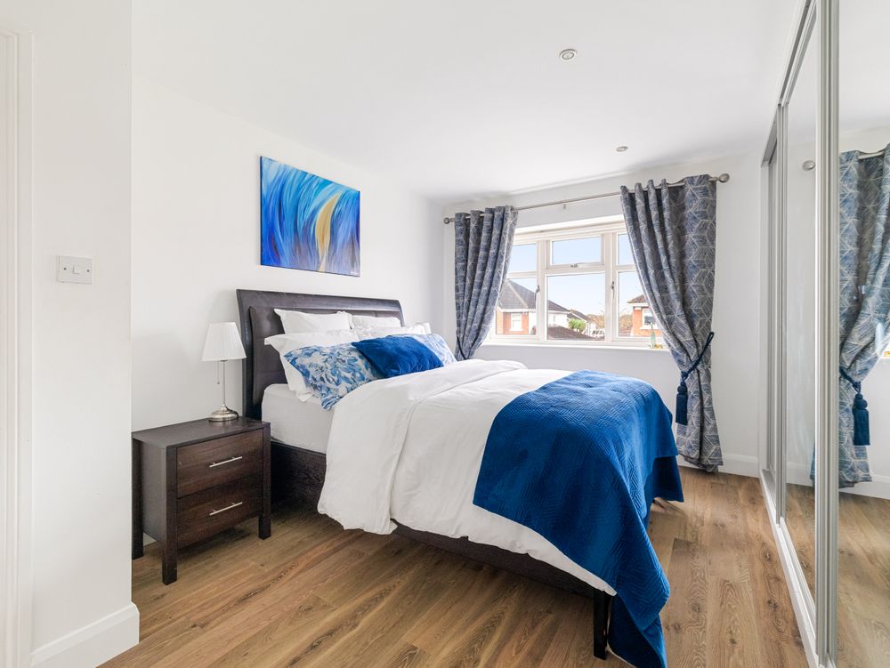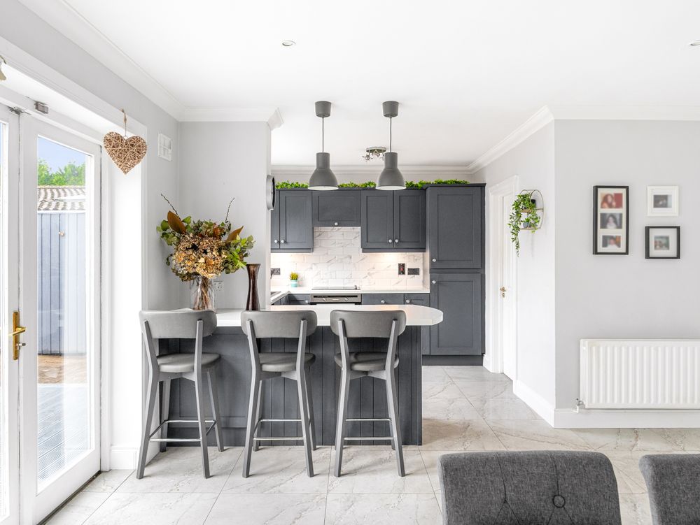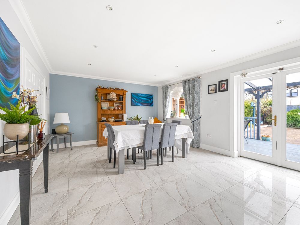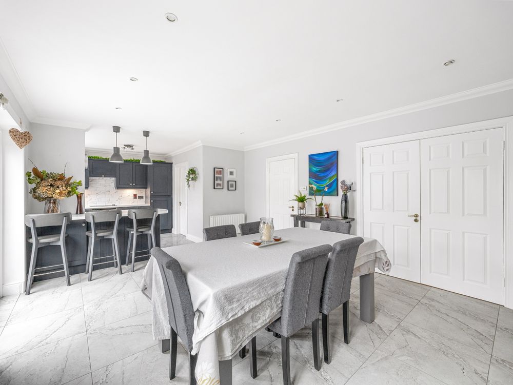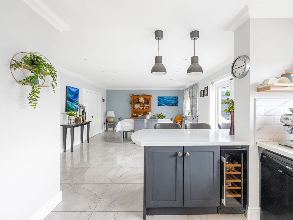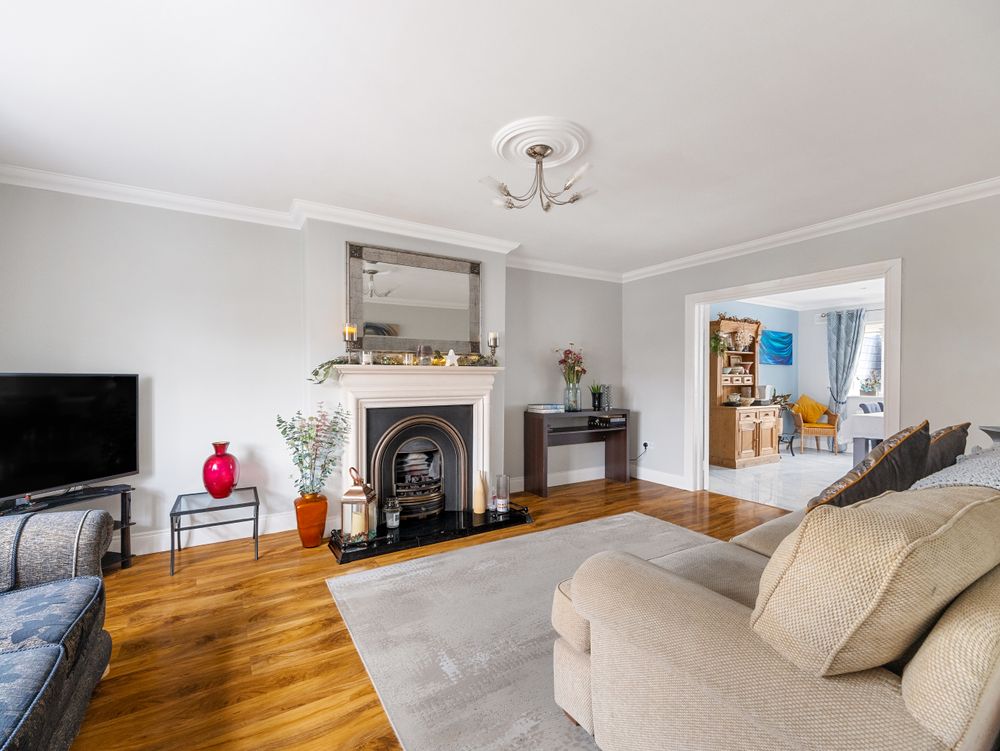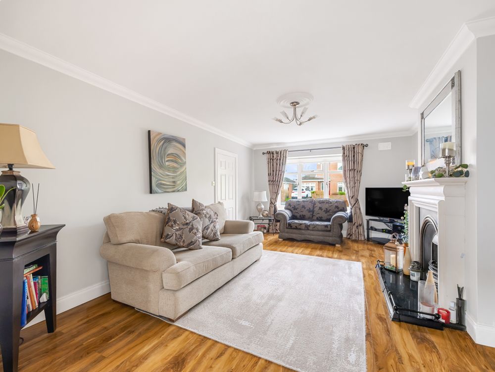 On entering the property, you are welcomed by a bright hallway with tiled flooring, creating a clean and contemporary first impression. To the left, the main sitting room features wooden flooring, decorative coving, a feature fireplace and a large picture window that fills the room with natural light. To the right, a second reception room provides excellent flexibility and would be ideal as a playroom, home office or TV room.