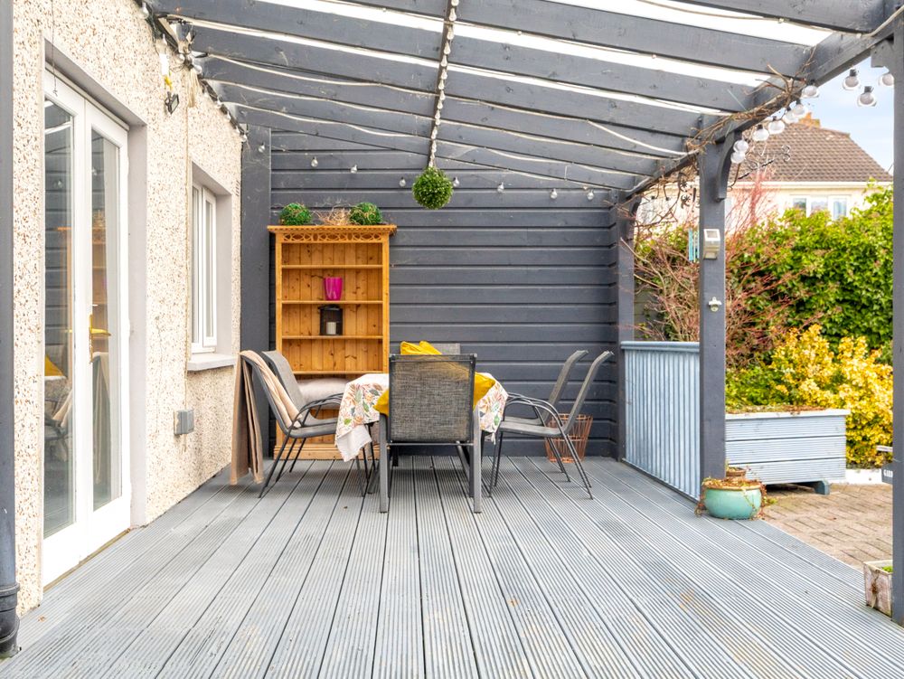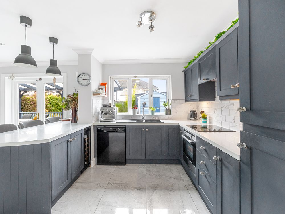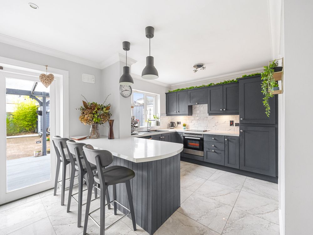 The kitchen is fully fitted and finished with tiled flooring and a breakfast bar, offering both style and practicality. Double doors open onto a covered decking area, creating a seamless indoor - outdoor flow that is perfect for entertaining or relaxing. A generously sized utility room and a guest WC complete the ground floor accommodation.