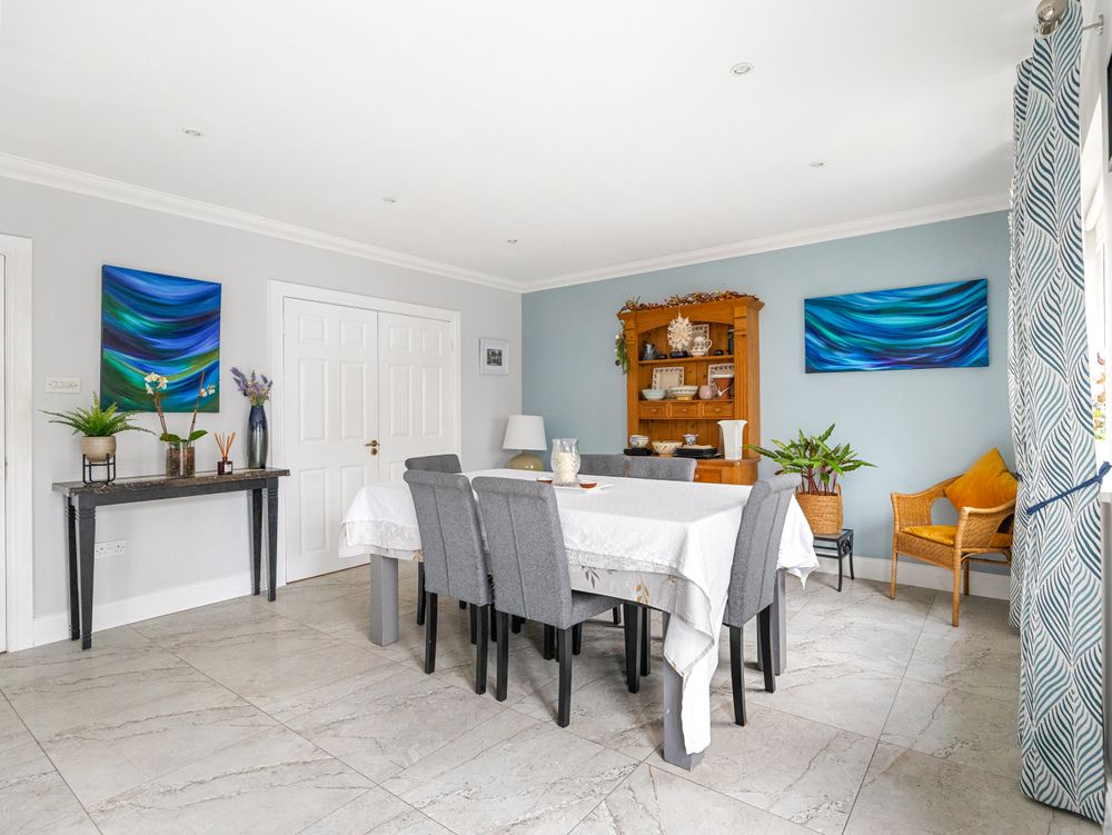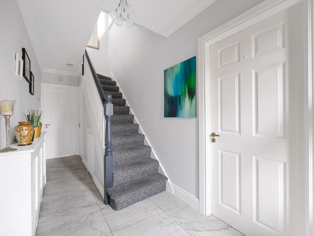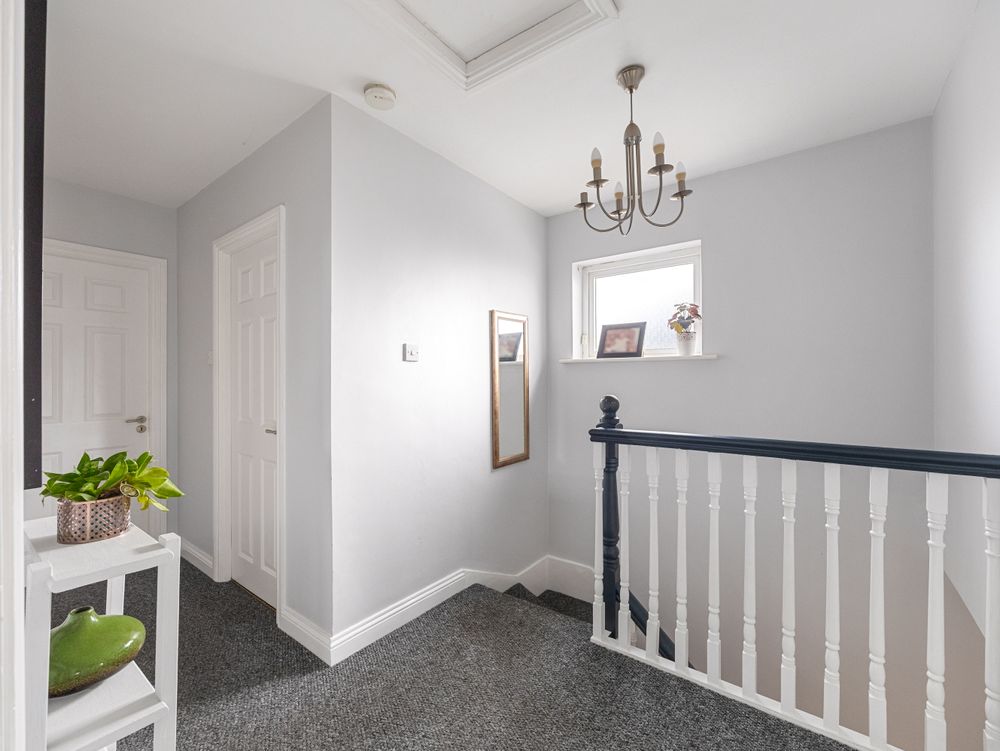 Upstairs, the carpeted stairs and landing lead to four well-proportioned bedrooms. The principal bedroom benefits from a beautifully tiled ensuite, while a fully tiled family bathroom serves the remaining bedrooms.