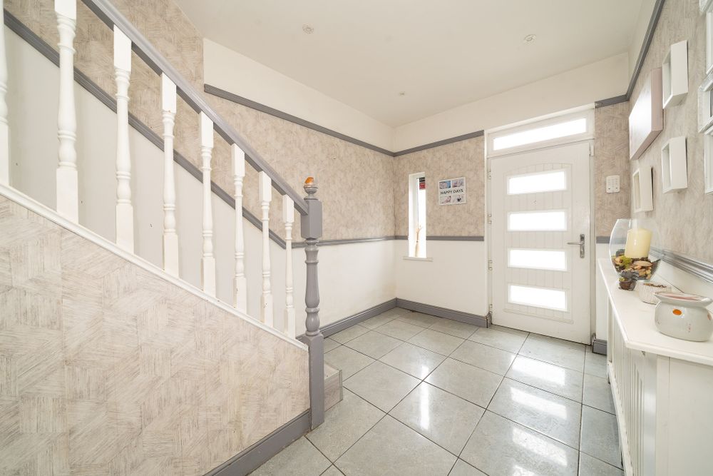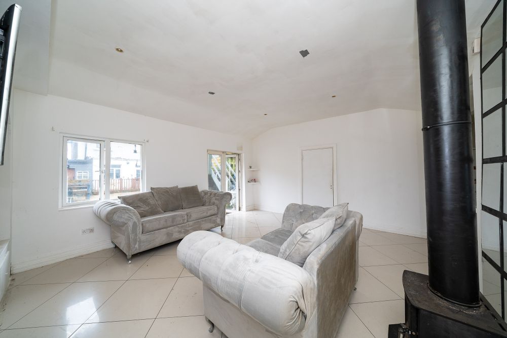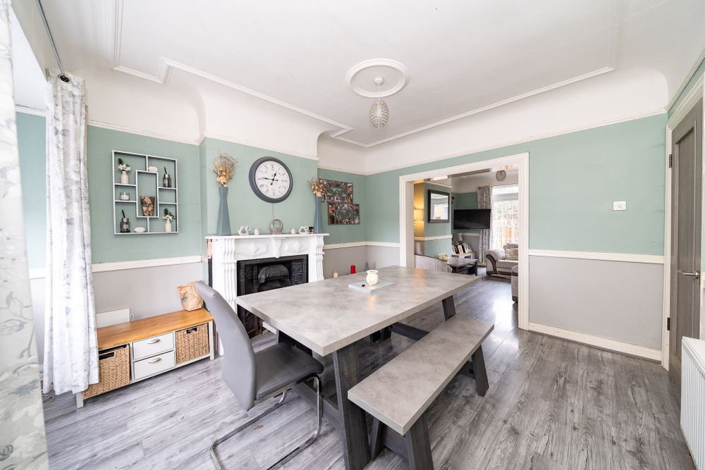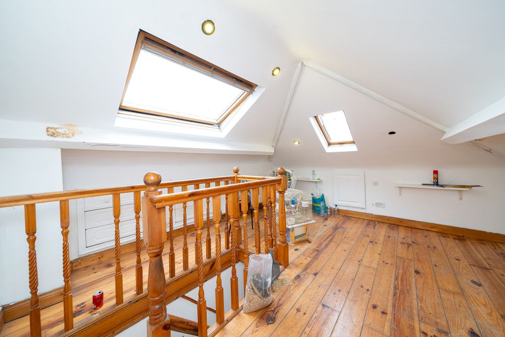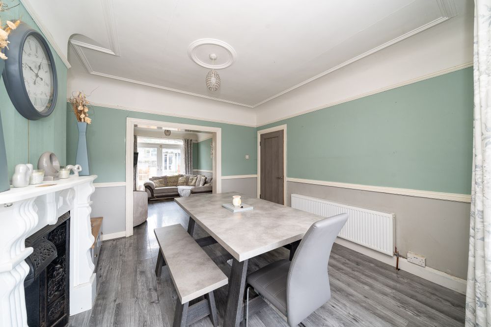 This superb family home enjoys a paved driveway, leading to an attractive facade. The welcoming entrance hall features tiled flooring and provides access to the spacious accommodation throughout. To the left of the entrance, the open plan dining and living room enjoys a charming bay window, feature fireplace, and high ceilings, with laminate flooring extending through the living space. Double doors open from the living area onto a generous rear garden, perfect for outdoor entertaining. The modern kitchen boasts tiled floors, ample counter and storage space, and stylish splashback tiling. An additional room to the side of the property offers the ideal space for a home office or study. Upstairs, there are three well proportioned bedrooms and a family bathroom, complete with a walk in electric shower and a separate bath. The accommodation is further enhanced by a converted attic with a Velux window and extra storage space. No. 18 also benefits from a chalet at the rear of the property, which is fully wired and plumbed.