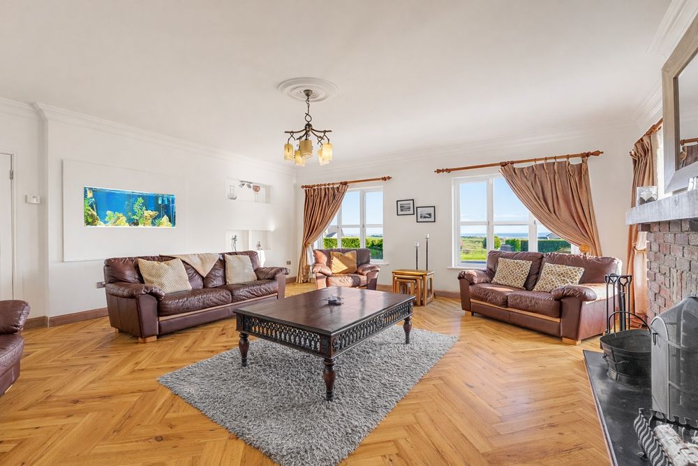 To the left, the principal reception room is a superb light-filled space featuring elegant wooden flooring, a striking red-brick fireplace with open fire, and multiple windows that frame the surrounding landscape and sweeping sea views. Beautifully proportioned, this room is perfectly suited to both relaxed family living and formal entertaining.