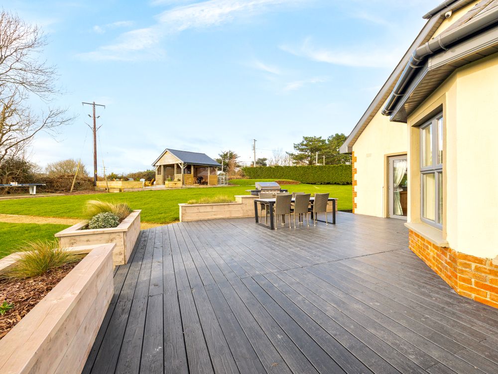 The expansive decked terrace provides an outstanding setting for outdoor dining and entertaining, complete with dedicated seating and BBQ area overlooking the sea. A separate fire pit area offers an atmospheric retreat beneath open skies, framed by the coastal horizon.
