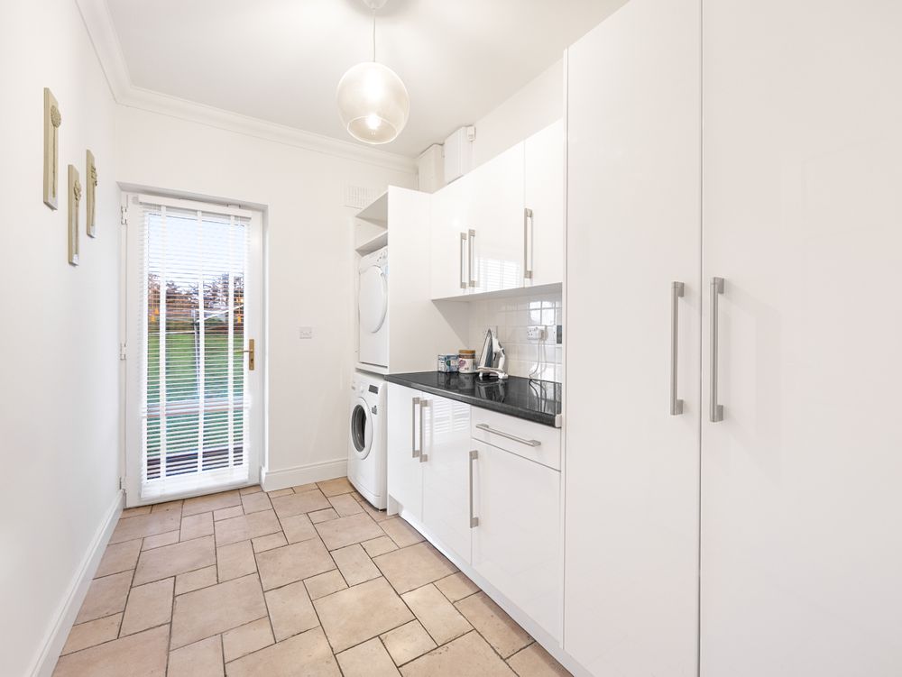 A large utility room is conveniently positioned just off the kitchen, providing excellent practicality and additional storage.