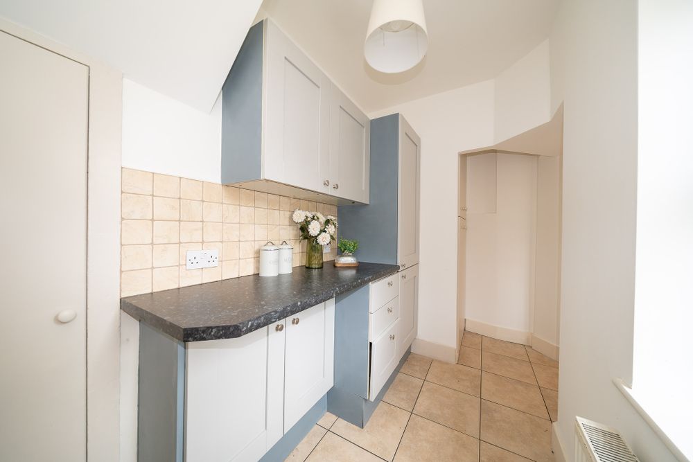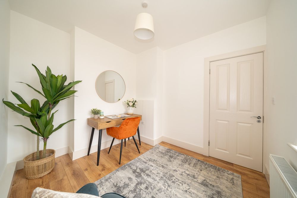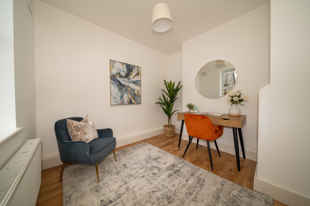 Exceptional two bedroom double fronted mid terrace home with a home office, a brick facade, a stylish interior and a large south west facing garden.