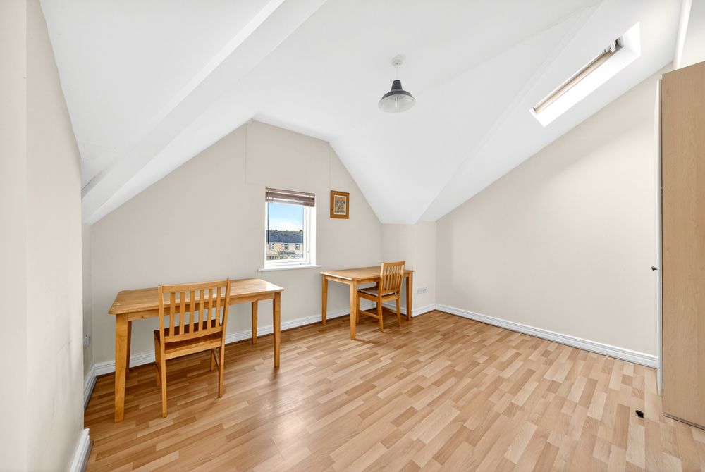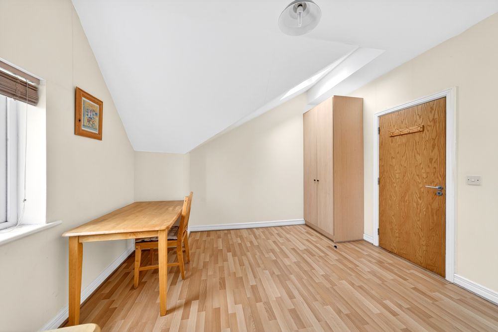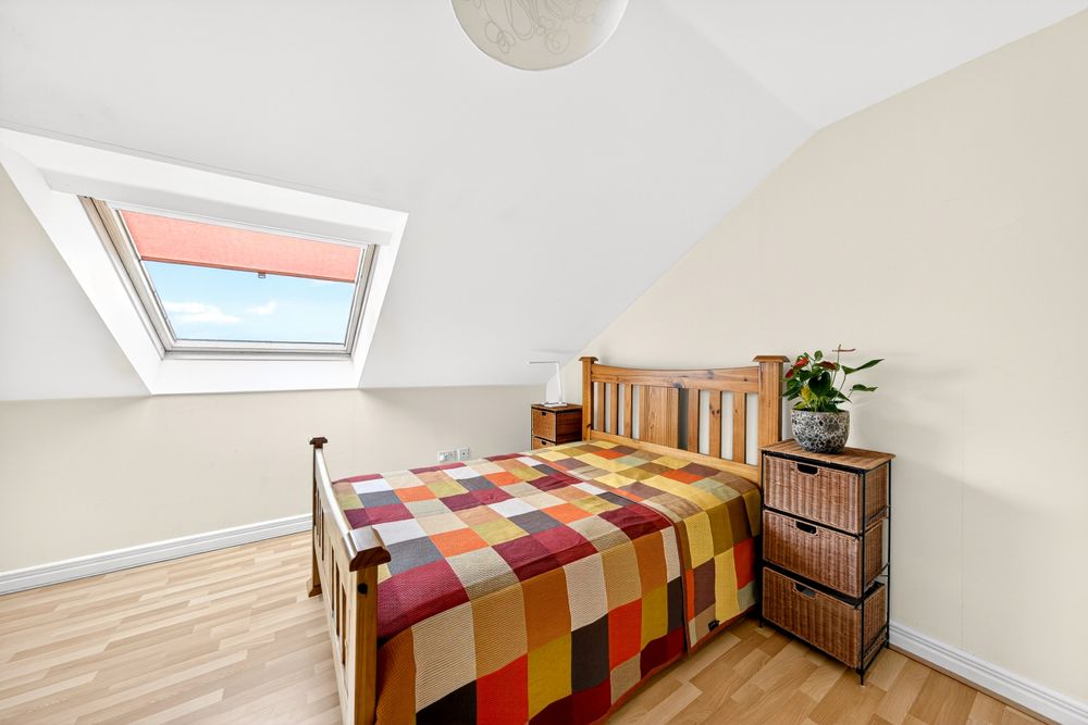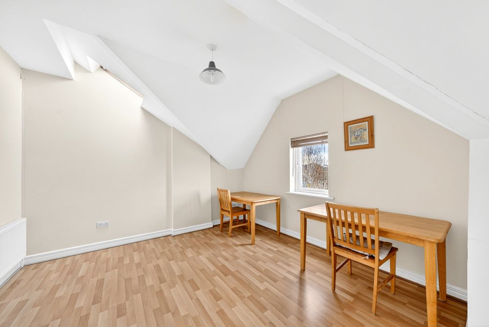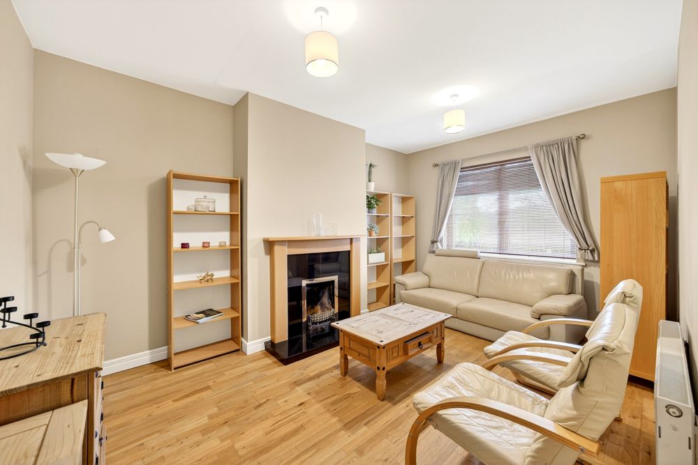 Spanning over 132 sq.m, the accommodation is both spacious and light-filled. The welcoming entrance hall leads to a refined sitting room with an open fireplace and a view over the front garden and green area, perfect for relaxing or entertaining. The contemporary kitchen/dining room is ideal for family living, with French doors opening onto the rear garden, blending indoor and outdoor spaces seamlessly. A guest W.C. completes the ground floor.