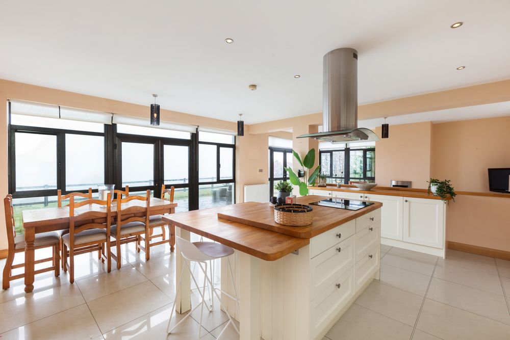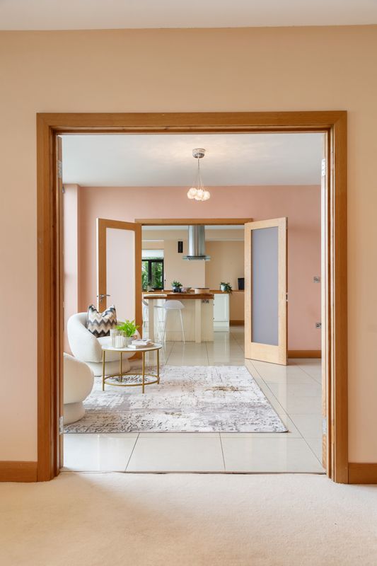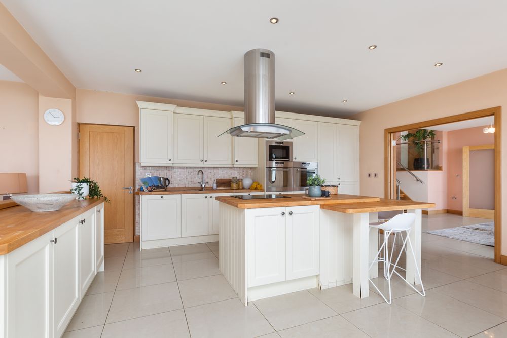 Kitchen Area - Fully Fitted Bespoke Cream Kitchen. Solid Oak worktops. Island. Porcelain floor. Patio doors to patio area/gardens. Door off to stairway leading up to dining hall. Double doors to Morning Room.