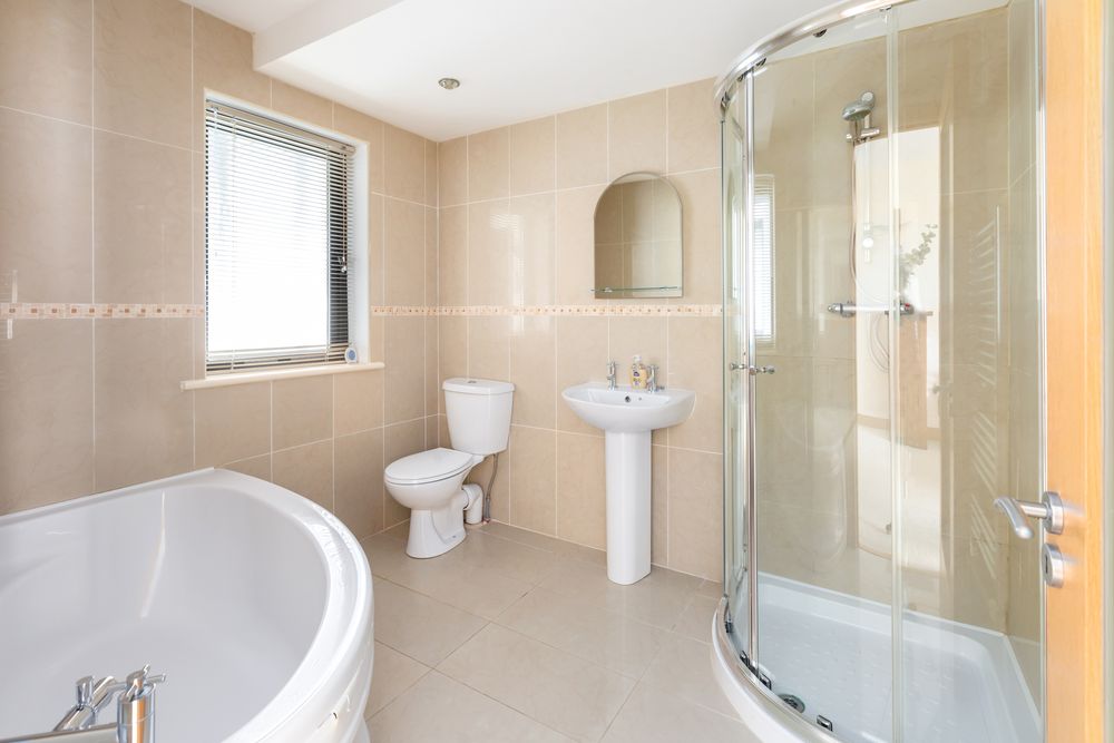 Ensuite Bathroom - (2.70M x 2.25M) WHB, WC, Bath & Power Shower. Porcelain Tiles. Insert Lighting.