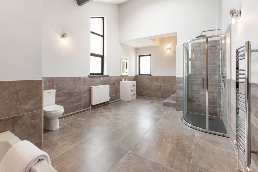Ensuite Bathroom - (6.30M x 3.65M) Power shower. 2 Wash hand basins. WC. Feature Bath. Fully tiled. Insert Lighting. Chrome Towel rails. Feature Window.