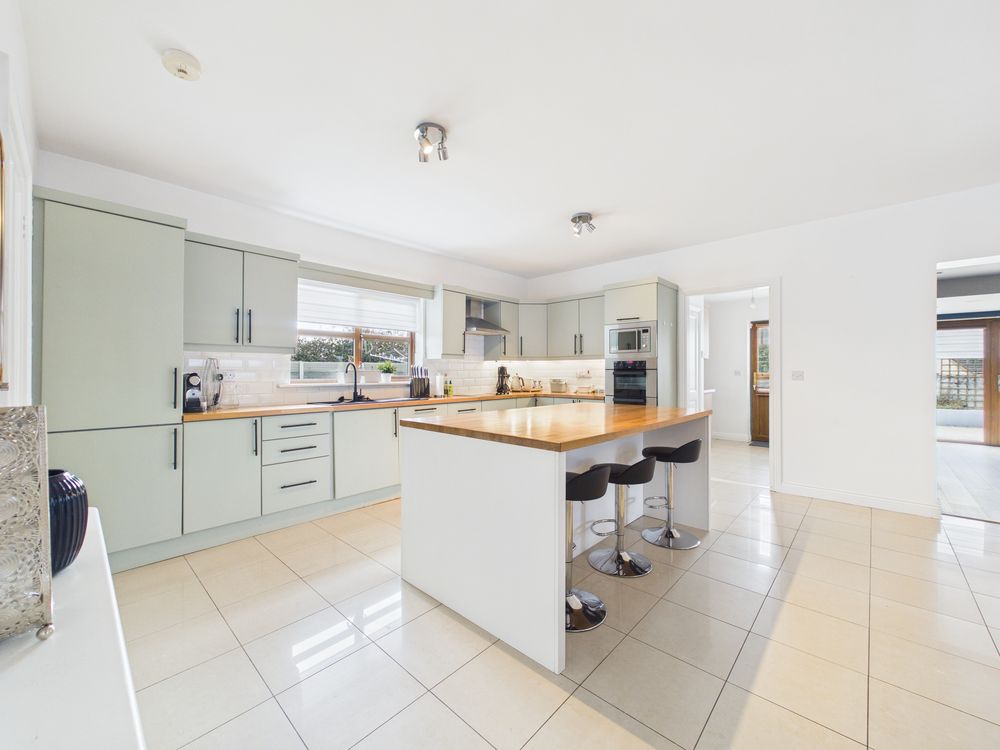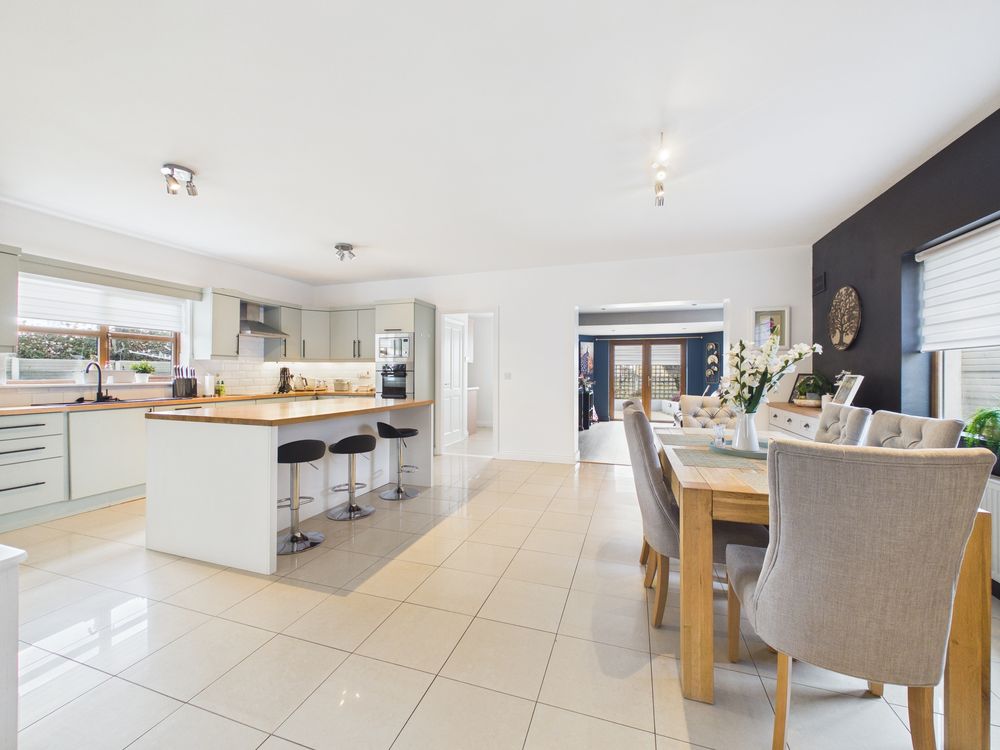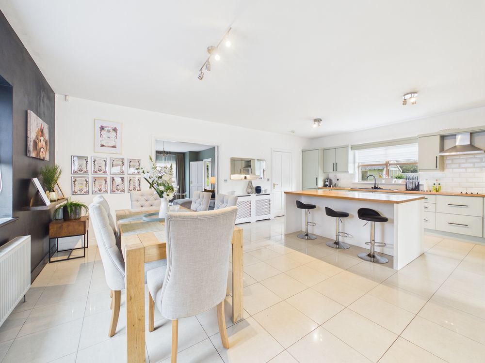 The heart of the property is the expansive kitchen and dining area, a bright and inviting space ideal for both everyday living and entertaining. High-quality cabinetry, excellent worktop space and a large central island combine style with functionality, while extensive glazing and a south facing aspect ensures an abundance of natural light throughout.