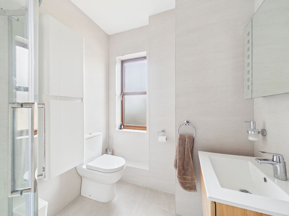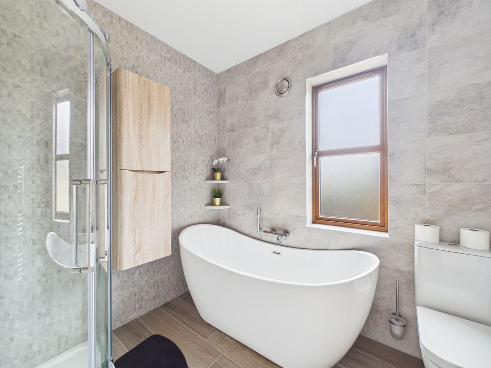 The main bathroom has been finished to an exceptional standard, featuring elegant tiling, a striking freestanding bath and separate shower, delivering a luxurious, spa-like feel.