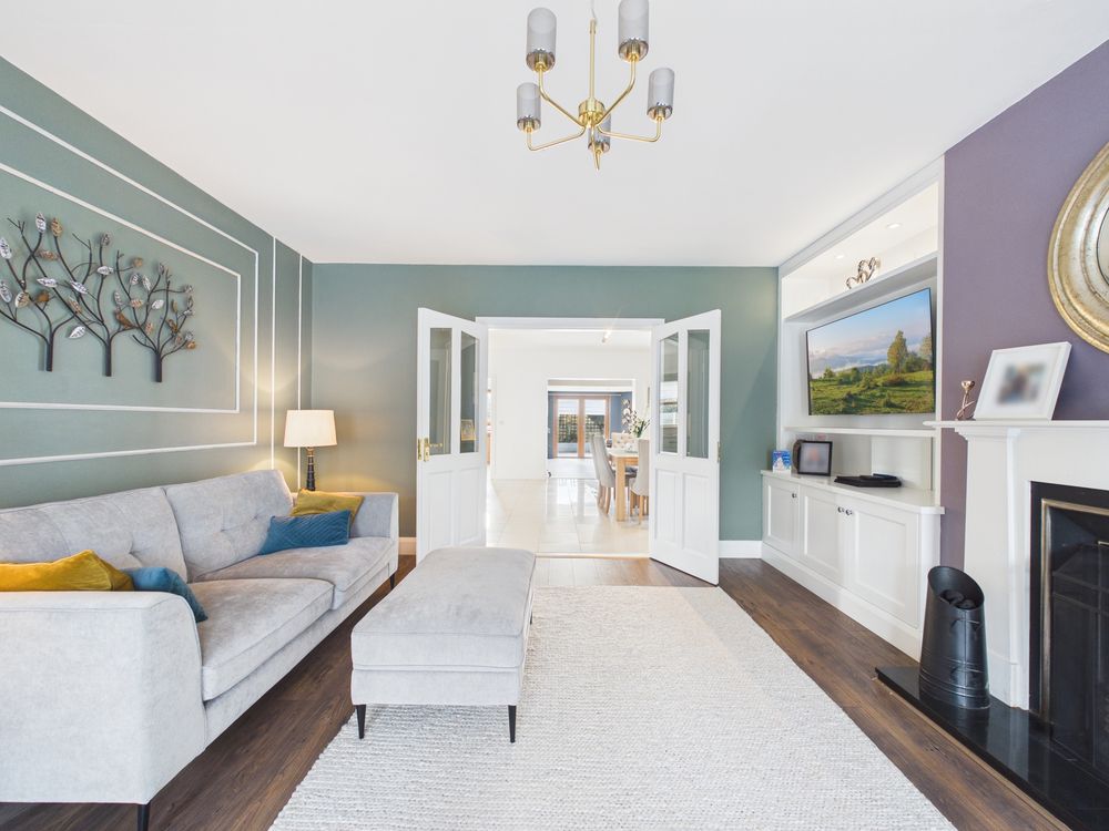 Step inside. The entrance hall sets the luxurious tone for the home, leading to a beautifully appointed sitting room where elegant bespoke cabinetry and refined finishes create a warm and sophisticated atmosphere. This space flows effortlessly into the rear of the property, where the home opens into an impressive open-plan living environment designed with modern family life in mind.