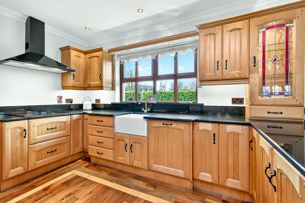 Fitted kitchen with granite worktop, integrated hob & extractor fan, hardwood flooring, coving, Belfast sink.