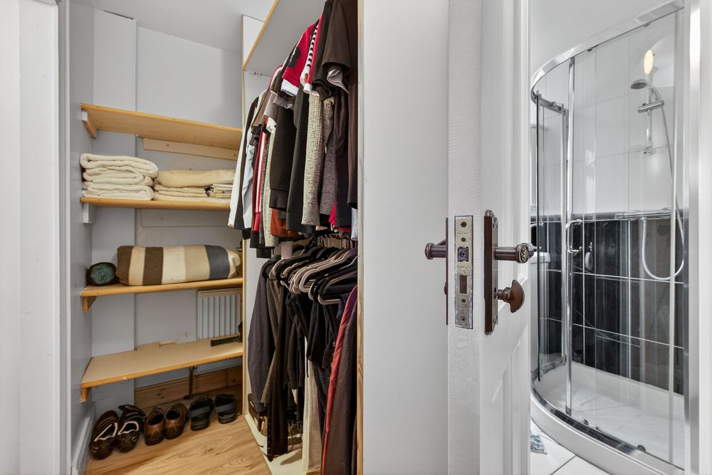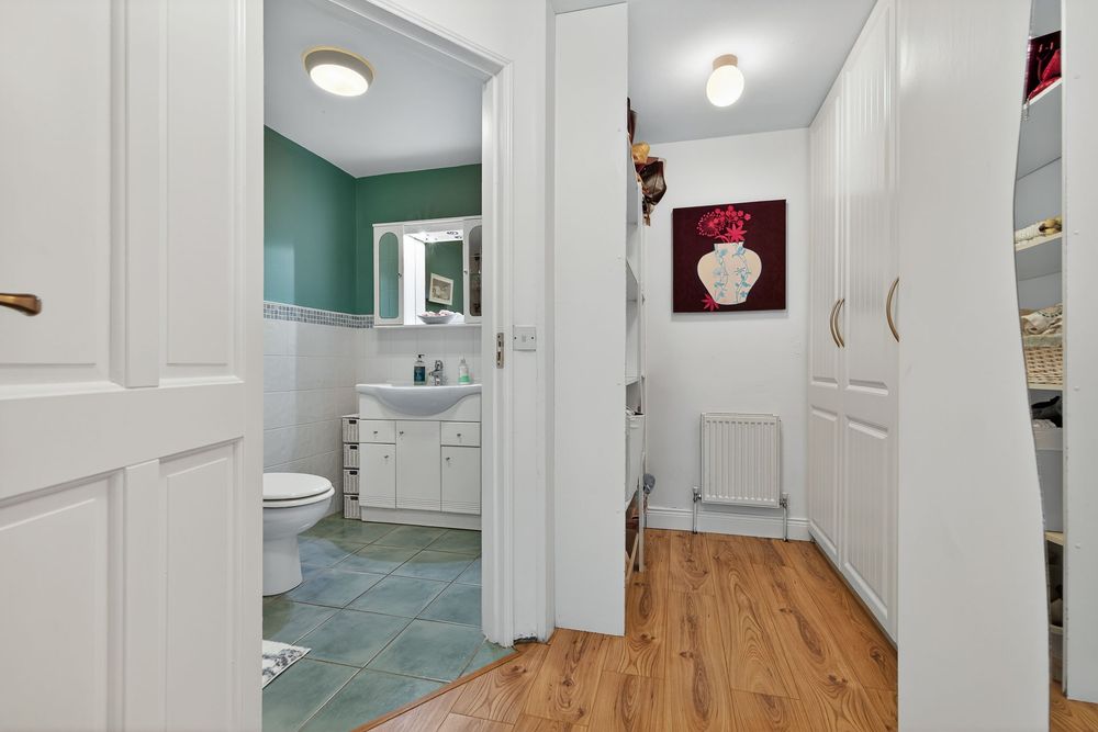 Finished with a laminate wood flooring and again this room has excellent natural light with windows on two gables, it has fitted shelving and it opens through to an area which houses an en-suite and excellent built-in wardrobes.