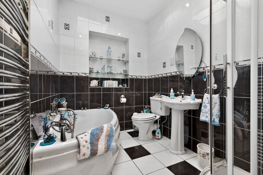 Finished with fully tiled floors, fully tiled walls, includes toilet, wash hand basin, bath and a separate shower. Very high standard of finish. Complete with vanity unit under sink and integrated mirror over.