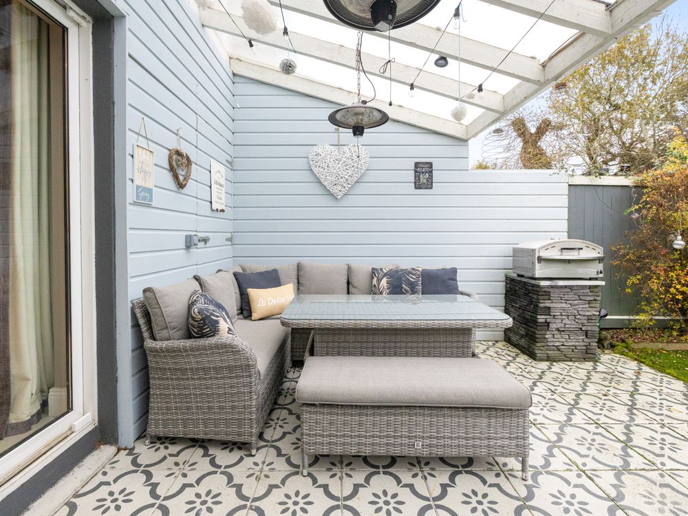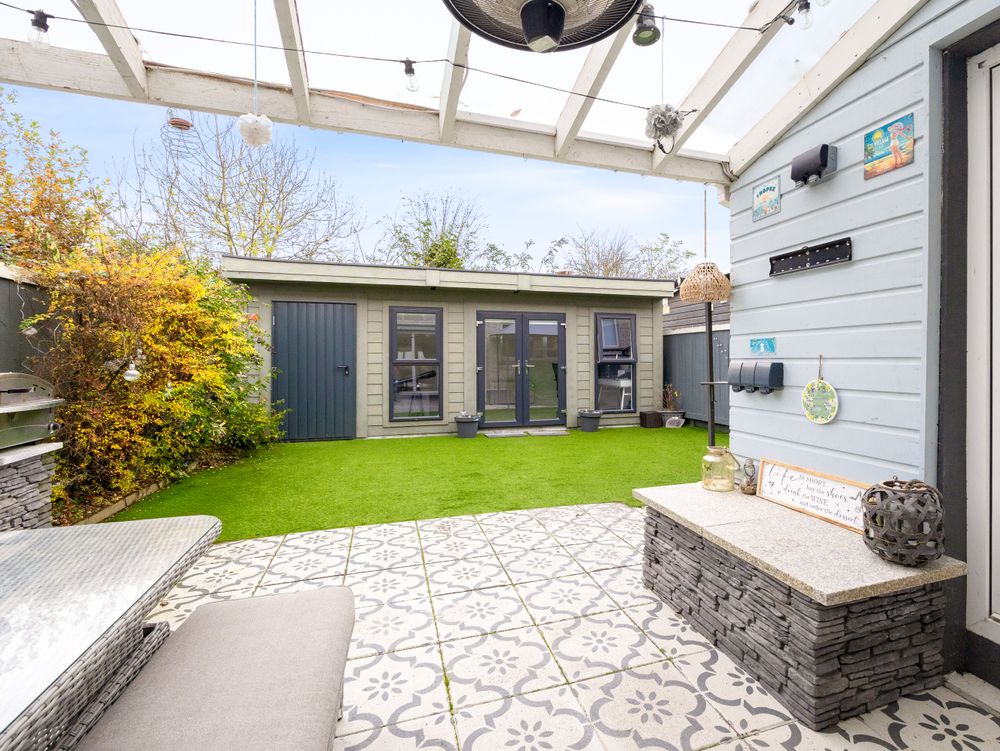 Further complementing the property, off the driveway, a side passage leads to the securely enclosed sunny garden of the coveted west facing aspect. Here, the current owners have created a thorough haven for both young and old! Partially landscaped with lawn, the garden is complemented by a decoratively tiled patio area with overhead cover, providing the perfect spot for outdoor entertaining even in the face of the changeable Irish weather! To the rear, a solid Seomra style structure offers another flexible space for a home office, playroom or any number of family uses!
