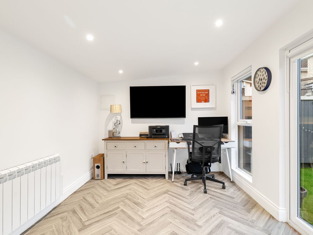 Measuring 116 sq.m approx. with spacious rear garden and additional Seomra home office (approx. 18 sq.m), number 35 is presented in pristine condition and situated in a prime position overlooking the green in this ever-popular development. Immaculately styled and filled with natural light, the accommodation includes a fantastic sitting room with feature wood burning effect fireplace flanked by seamlessly fitted shelving and solid herringbone laminate wood floors. From here, you will find a light filled kitchen/dining areas showcasing contemporary panelled kitchen cabinets in an elegant slate grey with pewter handles and durable granite countertops. Adding to the practicality of the space, is a well-appointed utility room along with a downstairs WC, beautifully tiled and styled in keeping with the rest of this beautiful home.