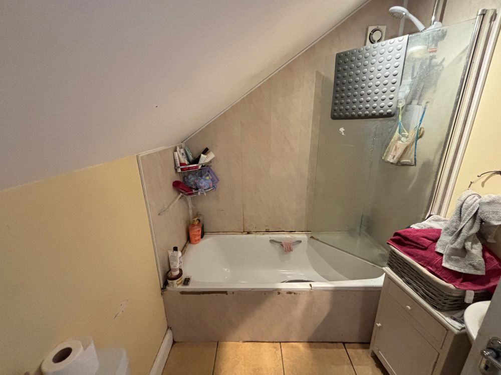 Fully fitted family bathroom comprising bath, wash hand basin, and WC, with a Triton T90S electric shower and tiled flooring.