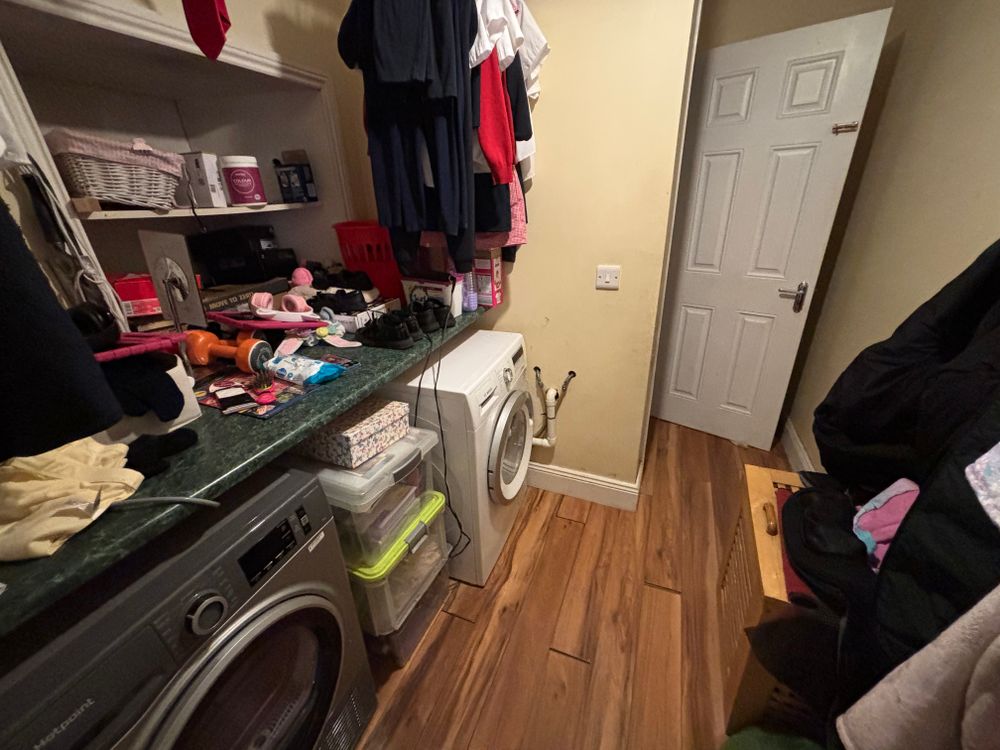 Functional utility space with laminate flooring, plumbed for washing machine and dryer, and offering additional worktop and storage space.