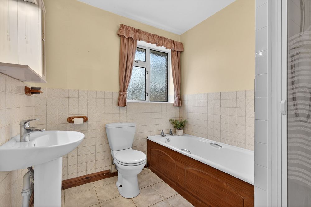 A spacious bathroom with tiled flooring, part tiled walls, toilet, wash hand basin, bath, and separate shower area with electric shower fitted.