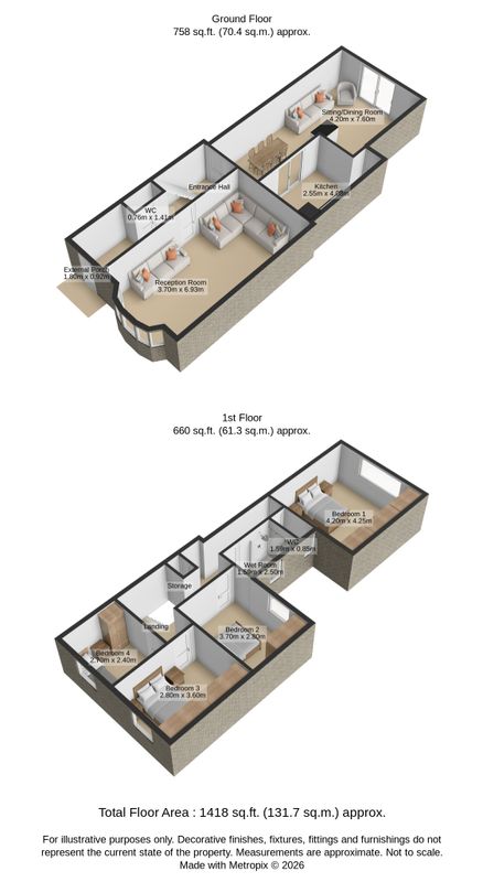 Upstairs, there are four well appointed bedrooms, all with built in storage, along with a main wet room style bathroom and a separate WC. The home benefits from OFCH, uPVC double glazed windows and doors, and a block built shed to the rear.