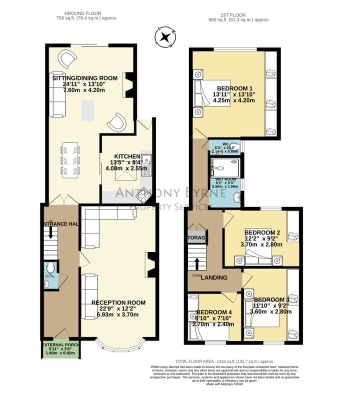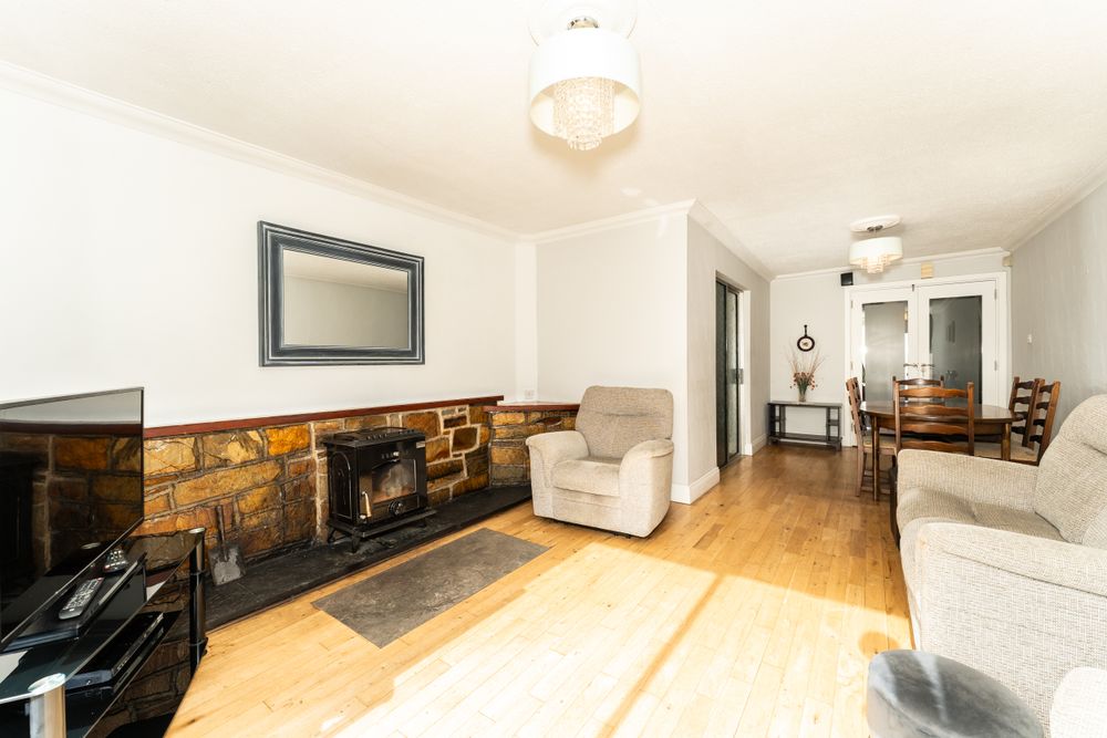 Built c.1955, the property has been thoughtfully laid out to maximise space, with two large reception areas on the ground floor, a fitted kitchen, and the added convenience of a downstairs WC. The rear sitting/dining room enjoys excellent natural light with sliding doors opening onto the sunny garden. A second reception room to the front provides flexibility for use as a family room, home office, or even a ground floor bedroom, with provisions for an electric shower already in place.