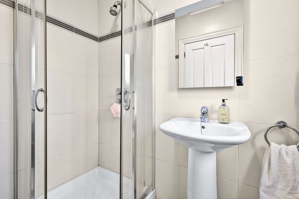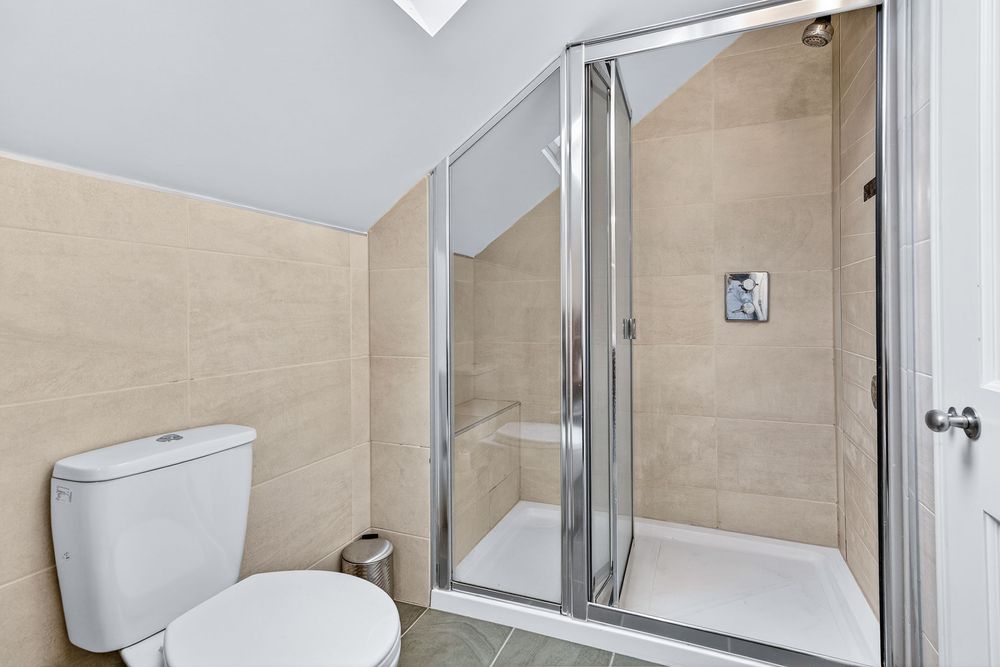 Fully tiled walls and floor, toilet, wash hand basin, corner shower.
