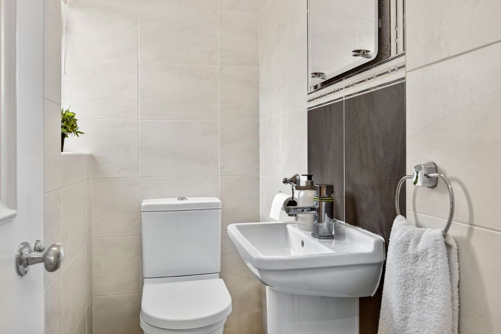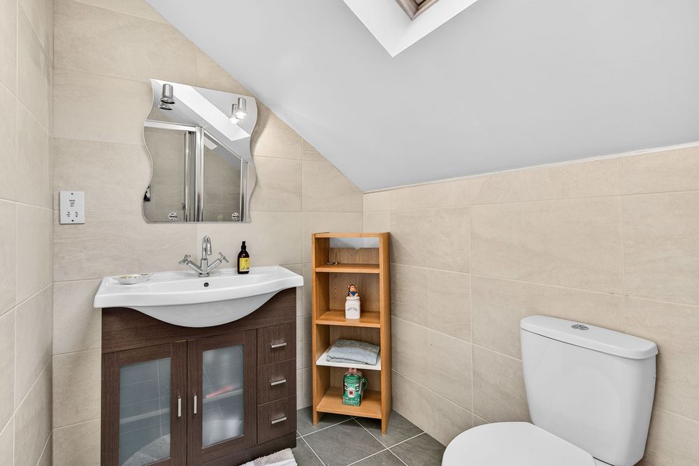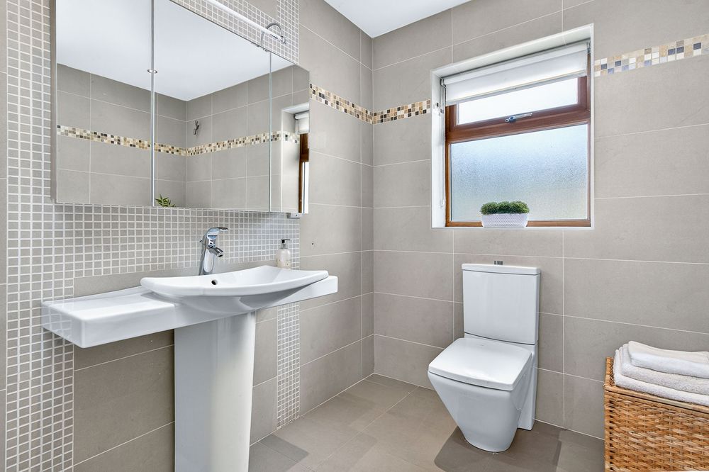 Fully tiled floors and walls, fitted with toilet and wash hand basin with integrated mirror over.