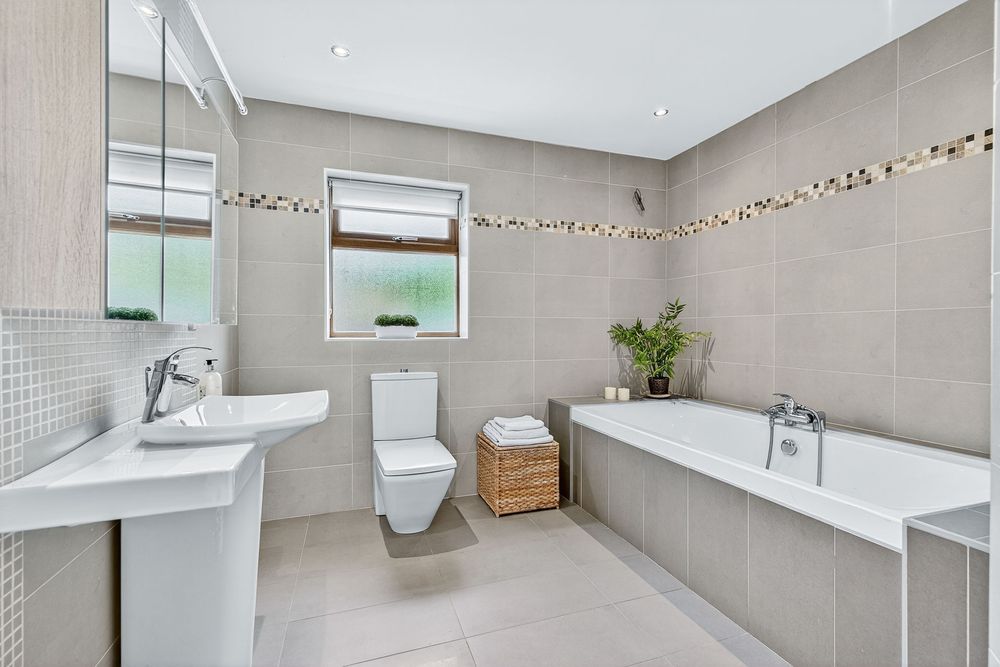 Fully tiled floors and walls, toilet, wash hand basin, feature bath with surround tile and shelving.