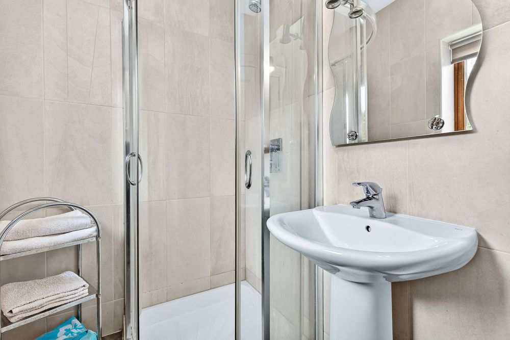 Fully tiled walls and floors, toilet, wash hand basin, corner shower.
