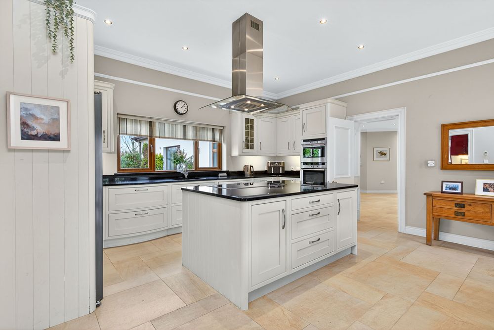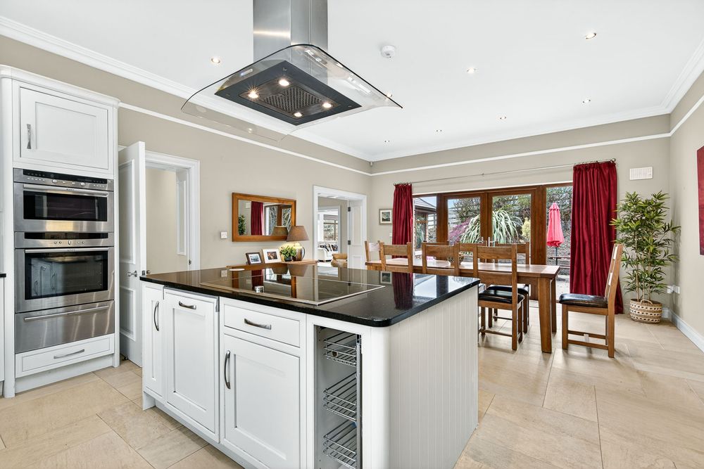 Tiled floor, extensive west-facing glazing , bespoke fitted kitchen with granite worktops, centre island with integrated appliances including double oven, hot plate, five ring Neff induction hob, American style fridge freezer and built in dishwasher.