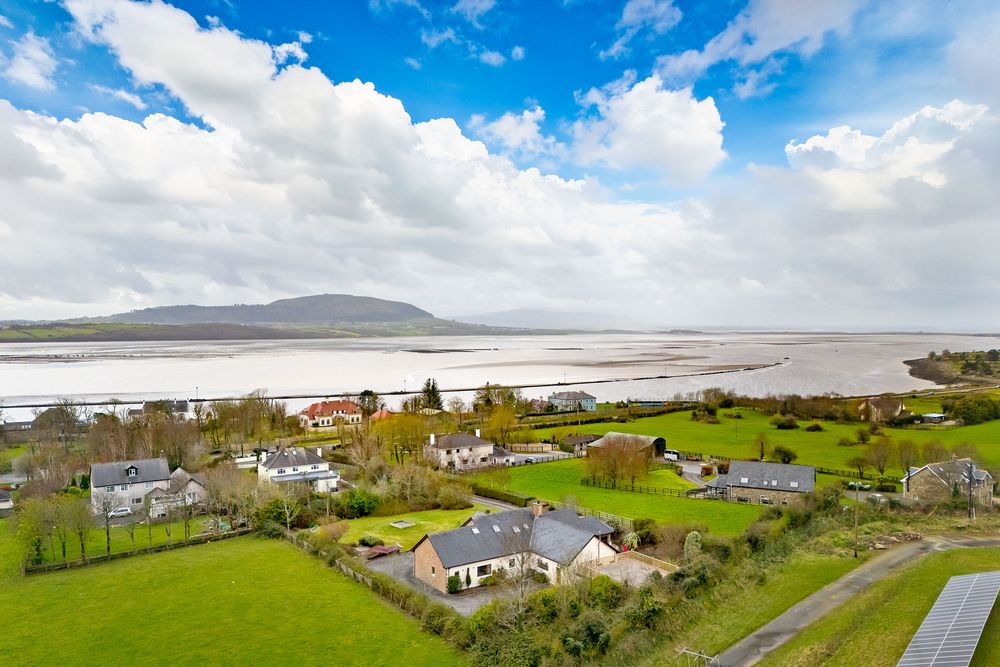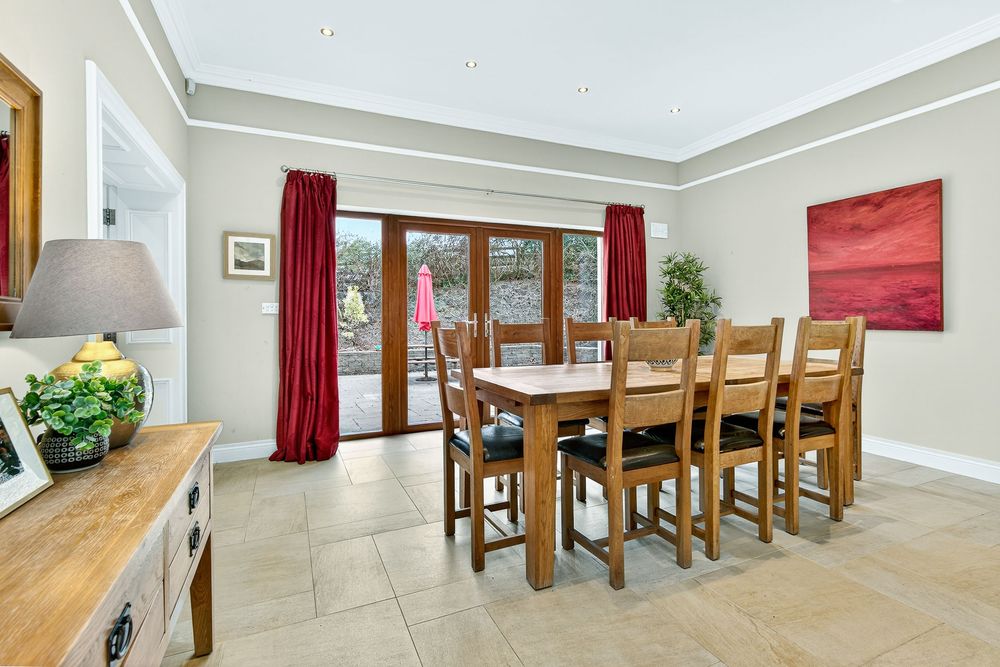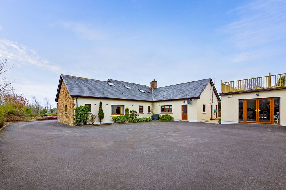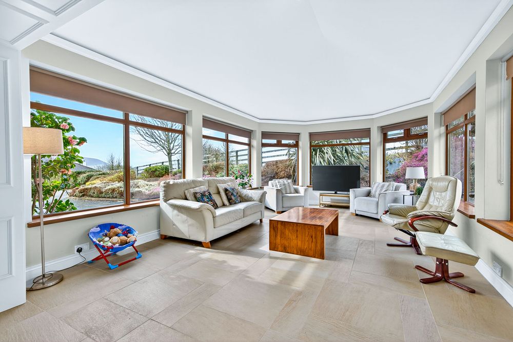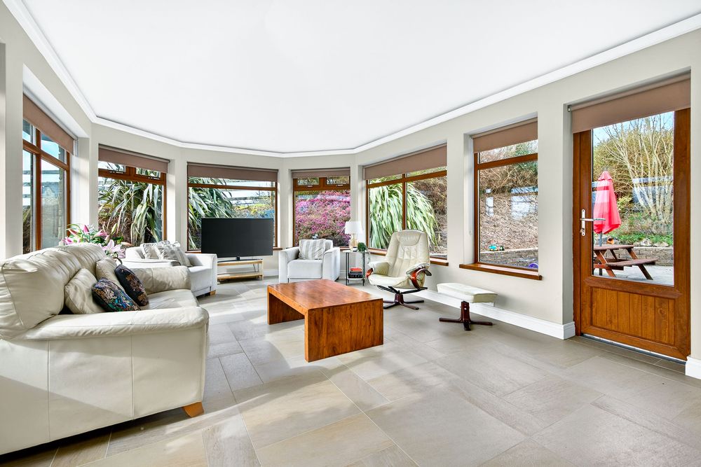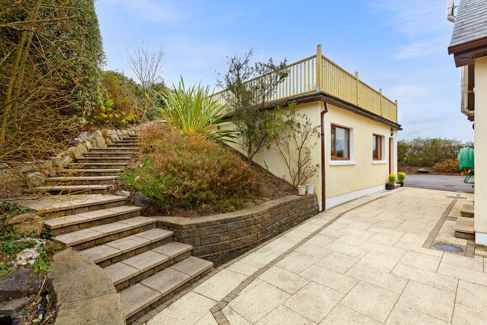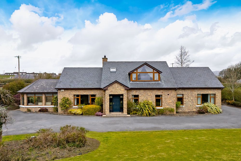 A sweeping private driveway leads to the house, which is enhanced by attractive stone-clad exterior finishes to the front and side gables and a substantial lawn to the front. Extensive paved patio areas lie off the sun lounge and kitchen/dining room, with steps rising to an elevated patio terrace over the detached building, creating a superb outdoor entertaining area with excellent views towards Sligo Bay.
