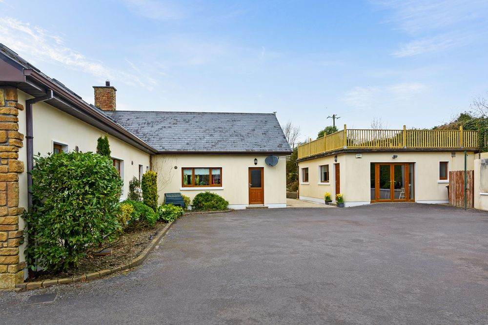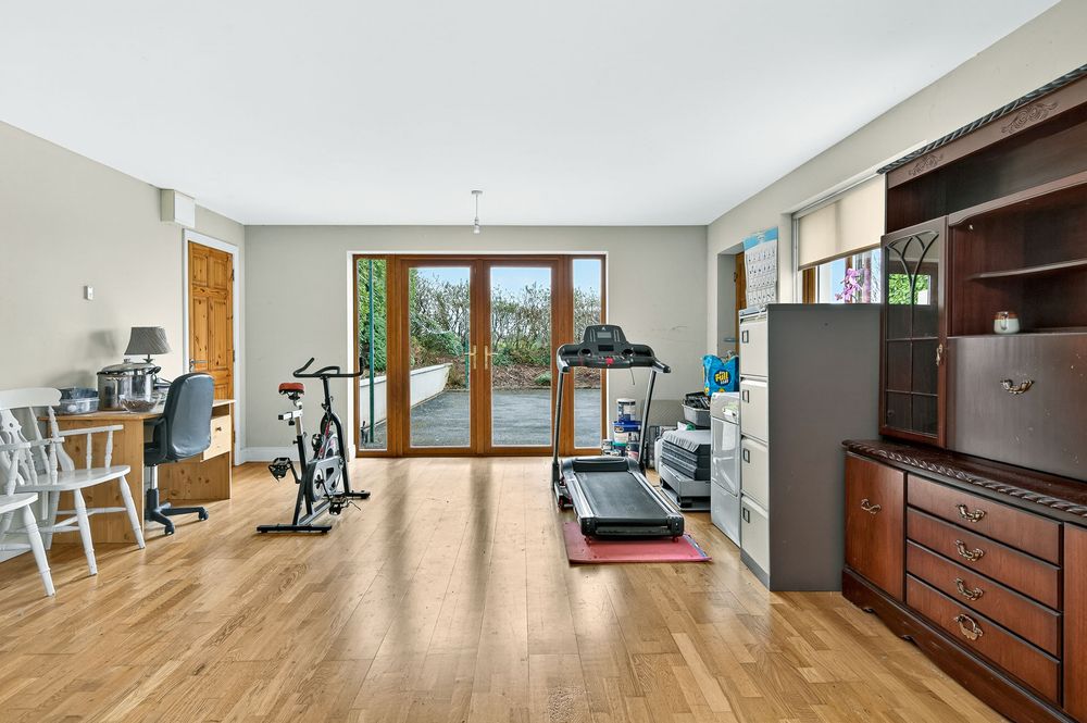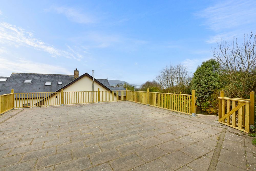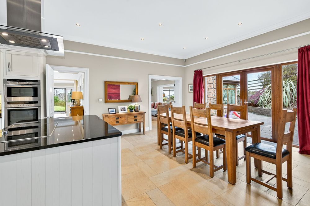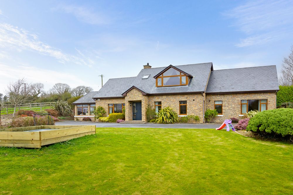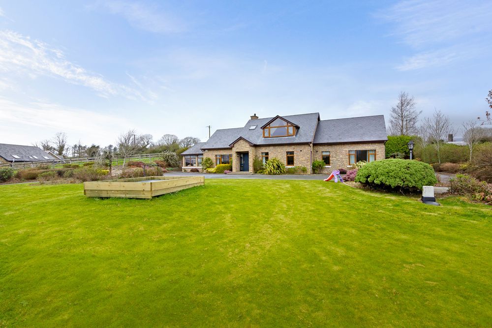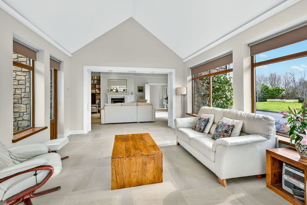 A sweeping private driveway leads to the house, which is enhanced by attractive stone-clad exterior finishes to the front and side gables and a substantial lawn to the front. Extensive paved patio areas lie off the sun lounge and kitchen/dining room, with steps rising to an elevated patio terrace over the detached building, creating a superb outdoor entertaining area with excellent views towards Sligo Bay.