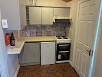 Incorporating kitchenette, lino floor, fitted kitchen units, open fireplace